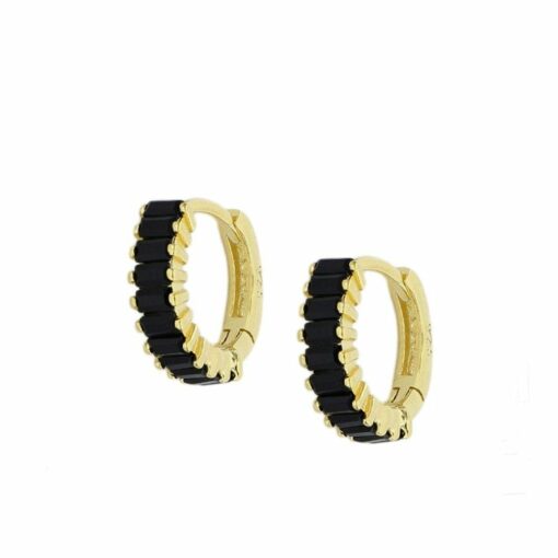 Pendientes aros en plata de ley chapado en oro con once circonitas baguette negras