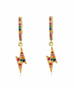 Pendientes aros en plata de ley chapados en oro con colgante en forma de rayo y circonitas de colores