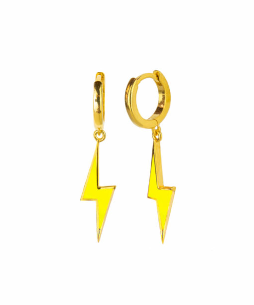 Pendientes aros en plata de ley chapado en oro del que pende un rayo con esmalte amarillo flúor.