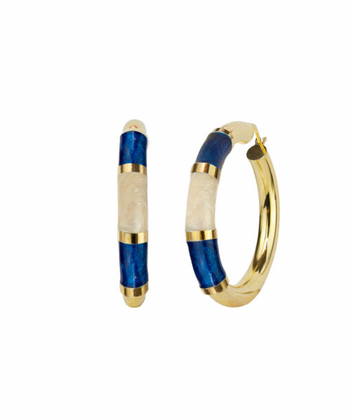 Pendientes aros en plata de ley chapados en oro con tres bandas de esmalte bicolor azul y crema.