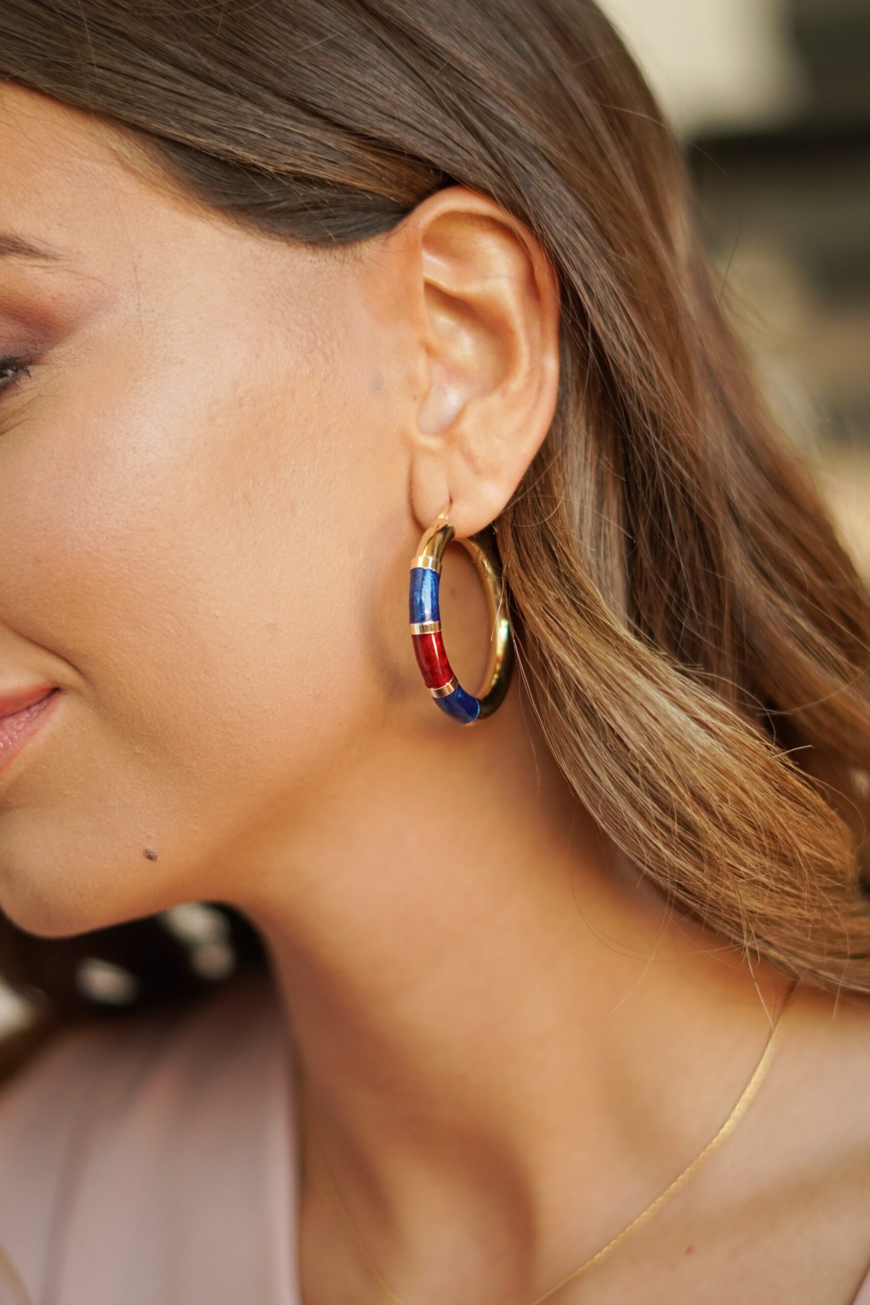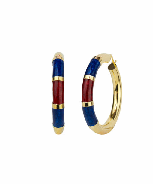 Pendientes aros en plata de ley chapados en oro con tres bandas de esmalte bicolor azul y rojo.