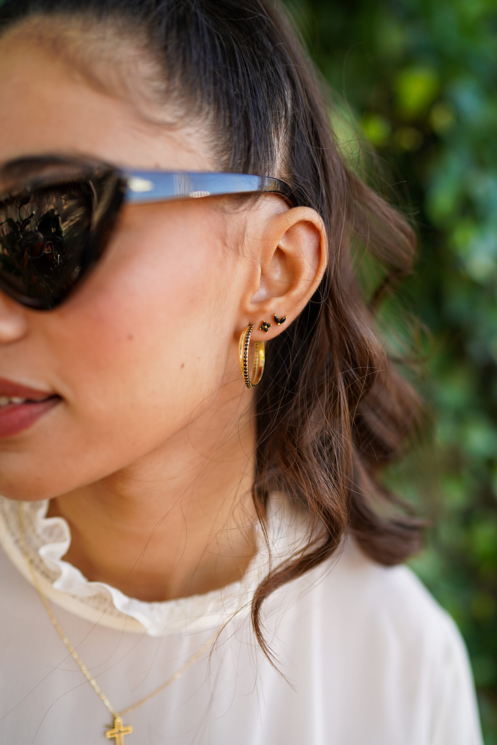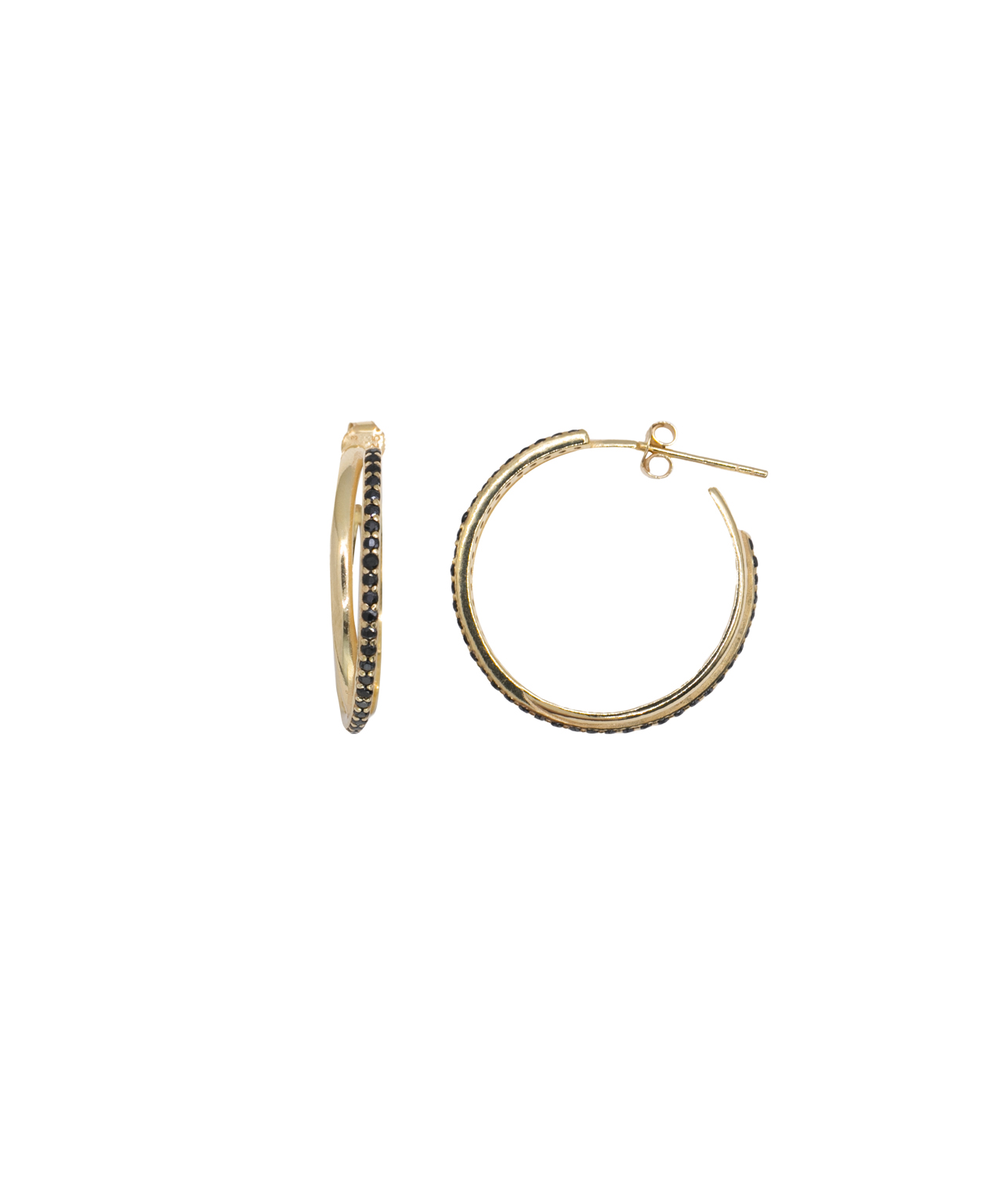 Pendientes aros en plata de ley chapados en oro con doble aro, uno de circonitas negras y otro liso.