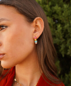 Pendientes aro, en plata de ley chapada en oro, con un diseño alegre y colorido compuesto por cuentas de resina en tonos vibrantes. Este accesorio combina la sofisticación del oro con un estilo fresco y divertido, perfecto para añadir un toque de color a tus conjuntos diarios o para destacar en ocasiones especiales.