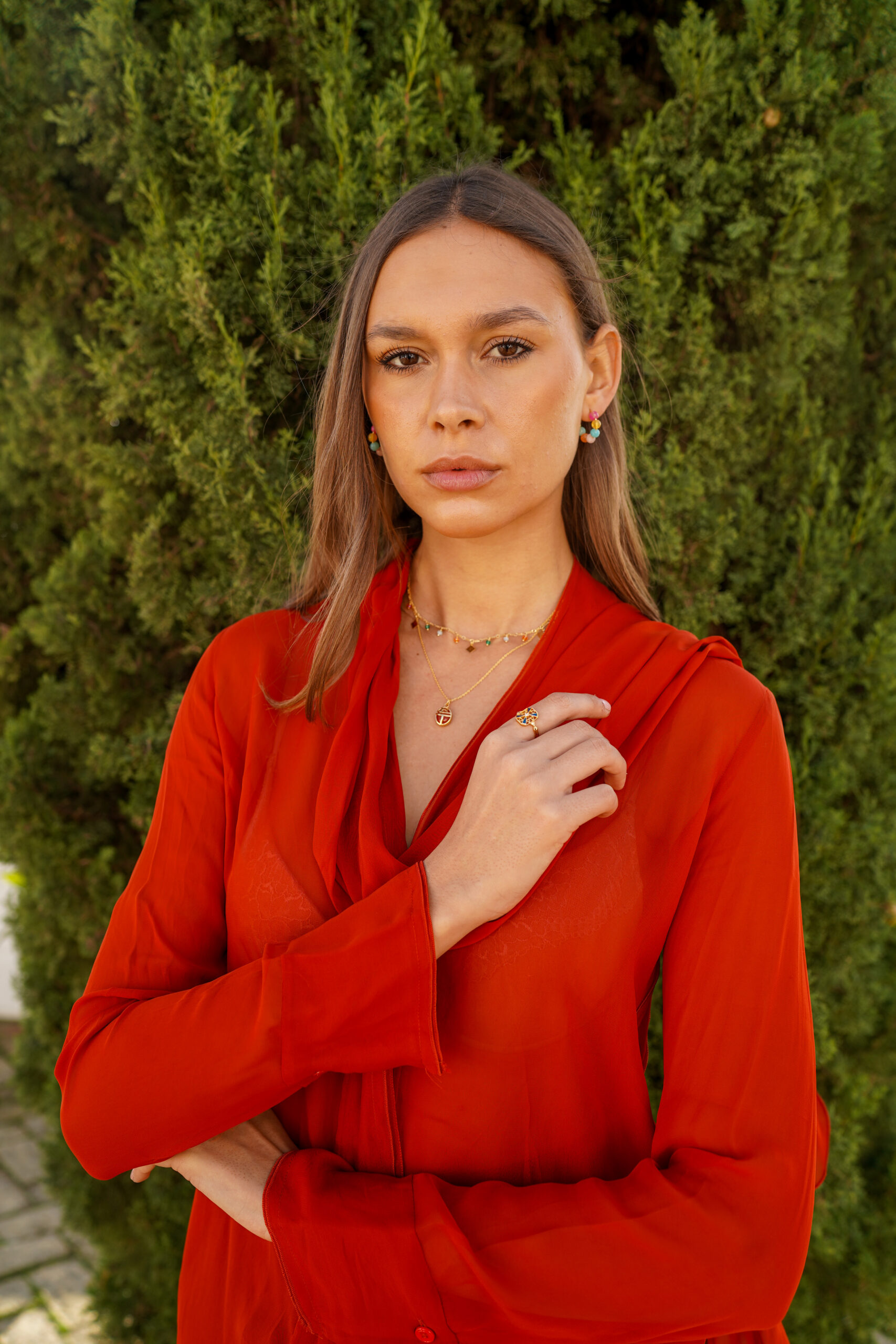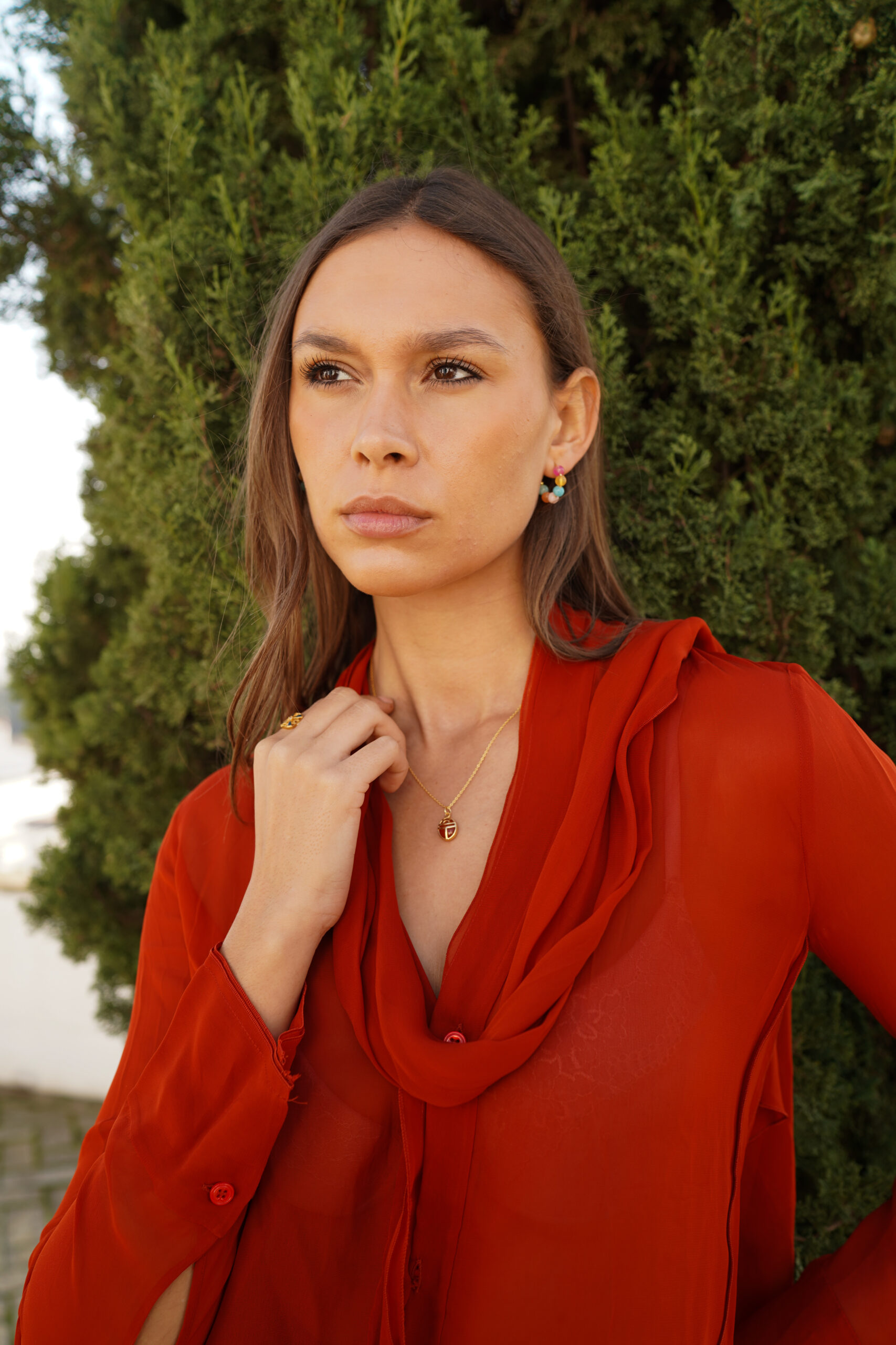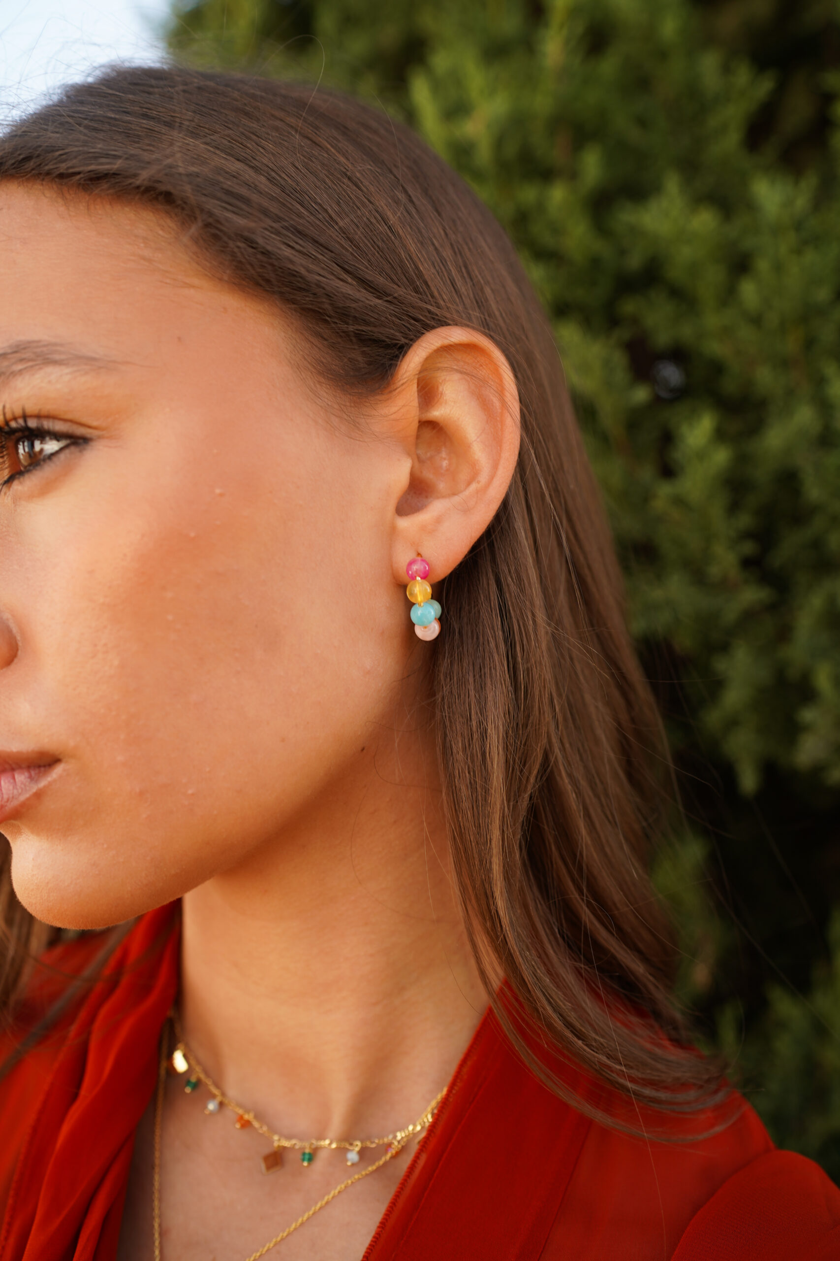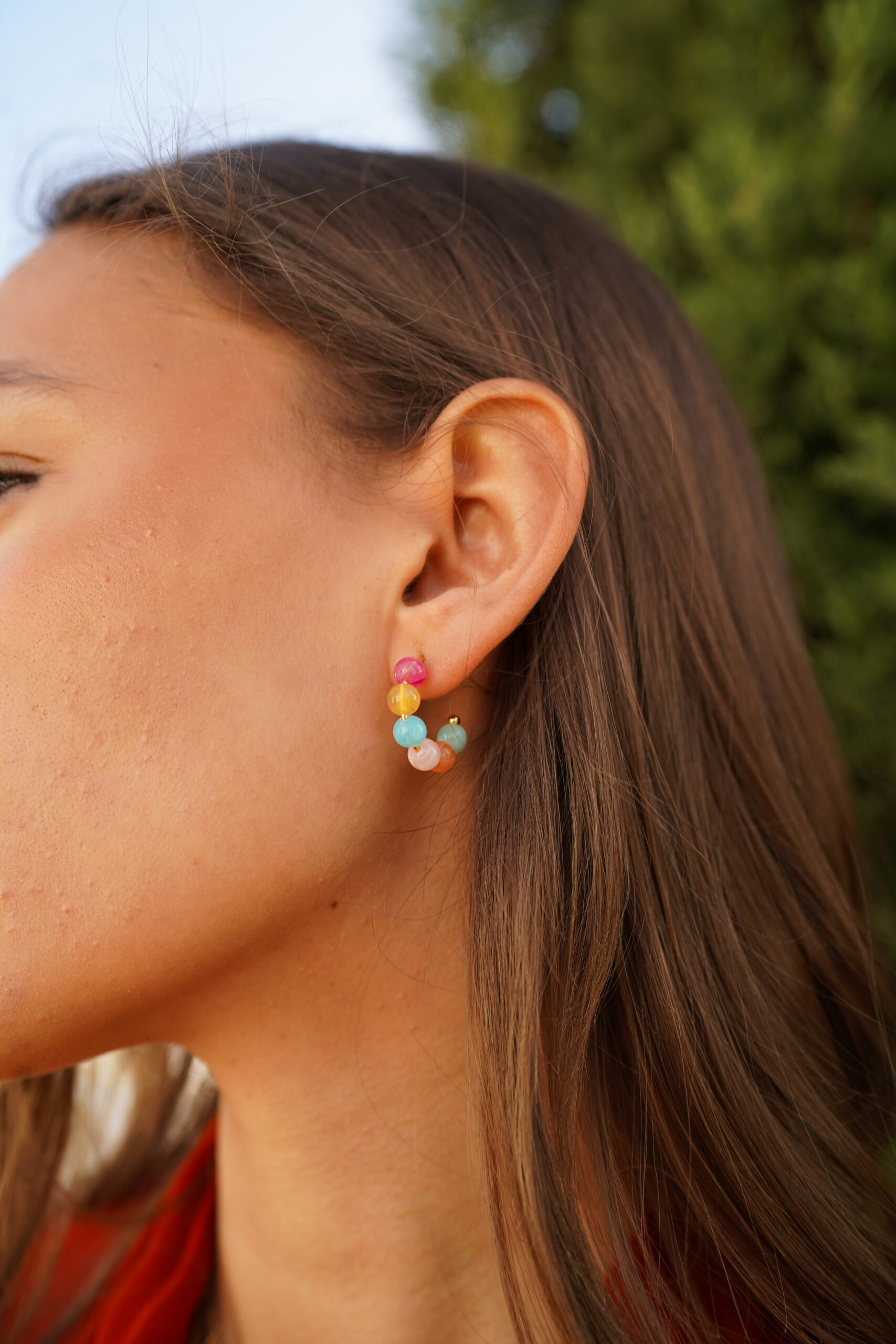 Pendientes aro, en plata de ley chapada en oro, con un diseño alegre y colorido compuesto por cuentas de resina en tonos vibrantes. Este accesorio combina la sofisticación del oro con un estilo fresco y divertido, perfecto para añadir un toque de color a tus conjuntos diarios o para destacar en ocasiones especiales.