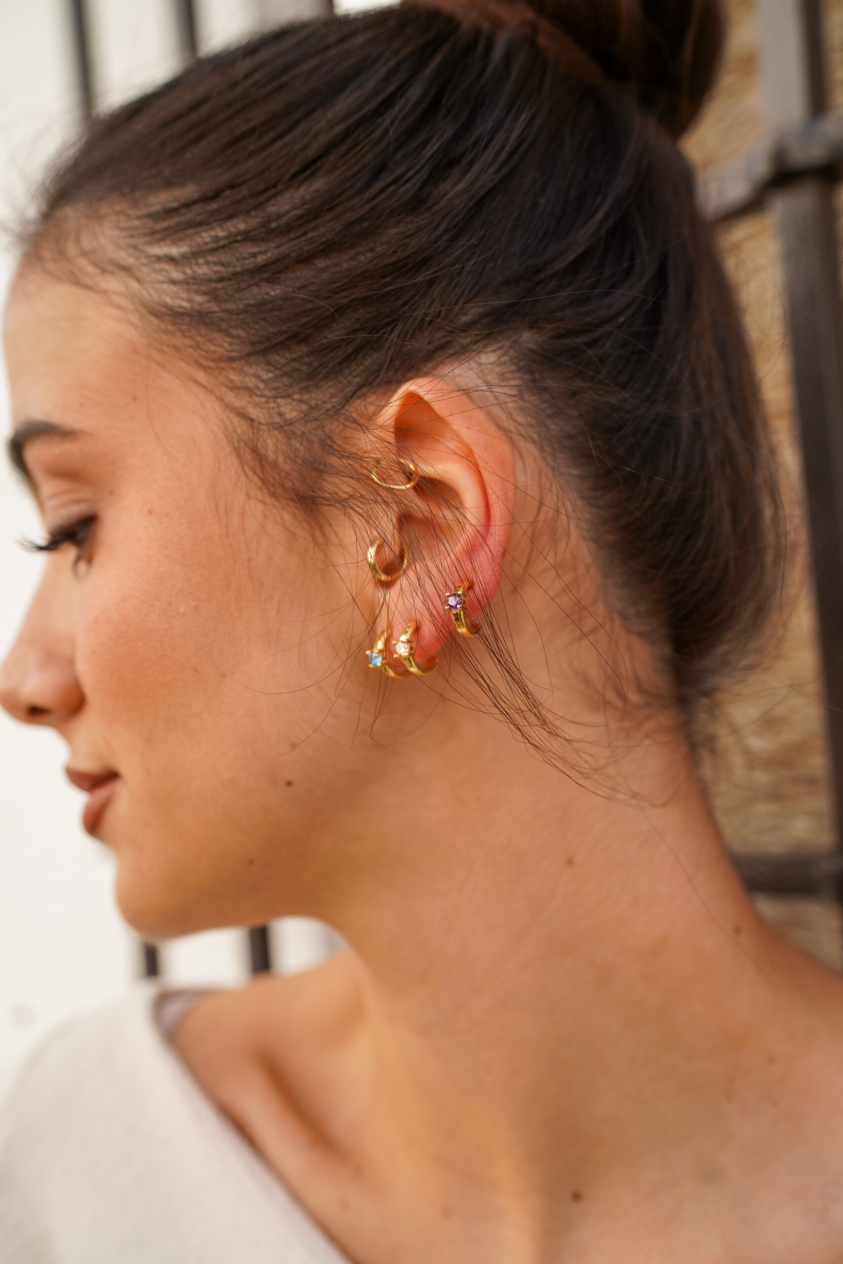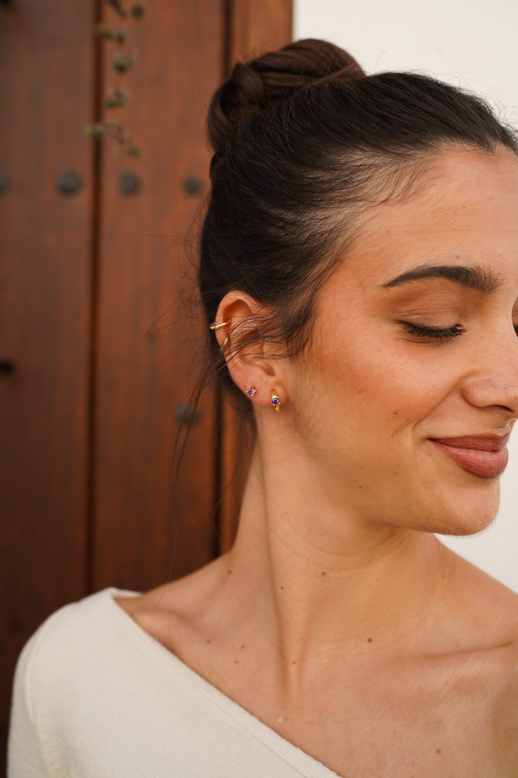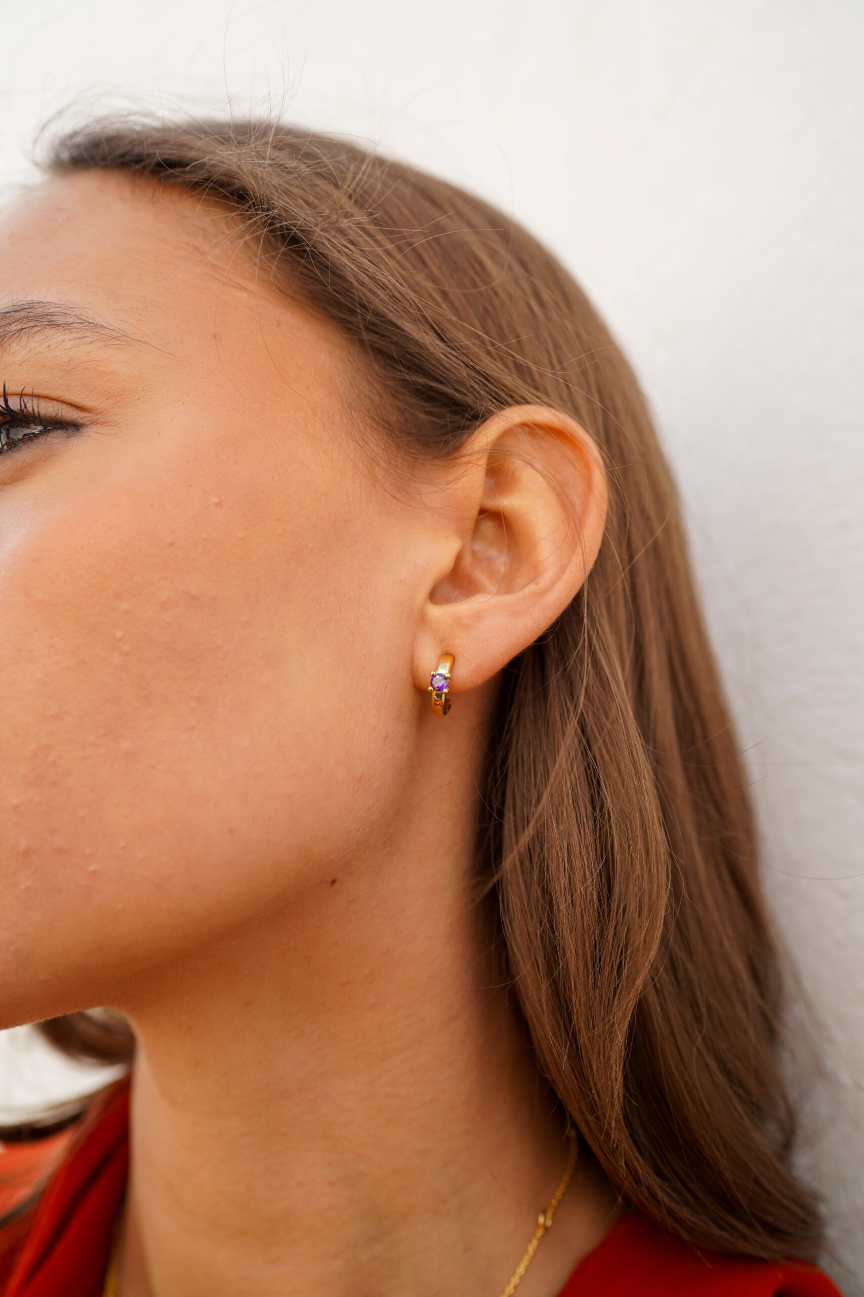 Pendientes aro elaborados en plata de ley chapada en oro, con un diseño minimalista que integra una circonita lila de corte brillante en cada pieza. Este accesorio combina la elegancia de los aros con el brillo sutil de las piedras, resultando en un diseño sofisticado y versátil para cualquier ocasión.