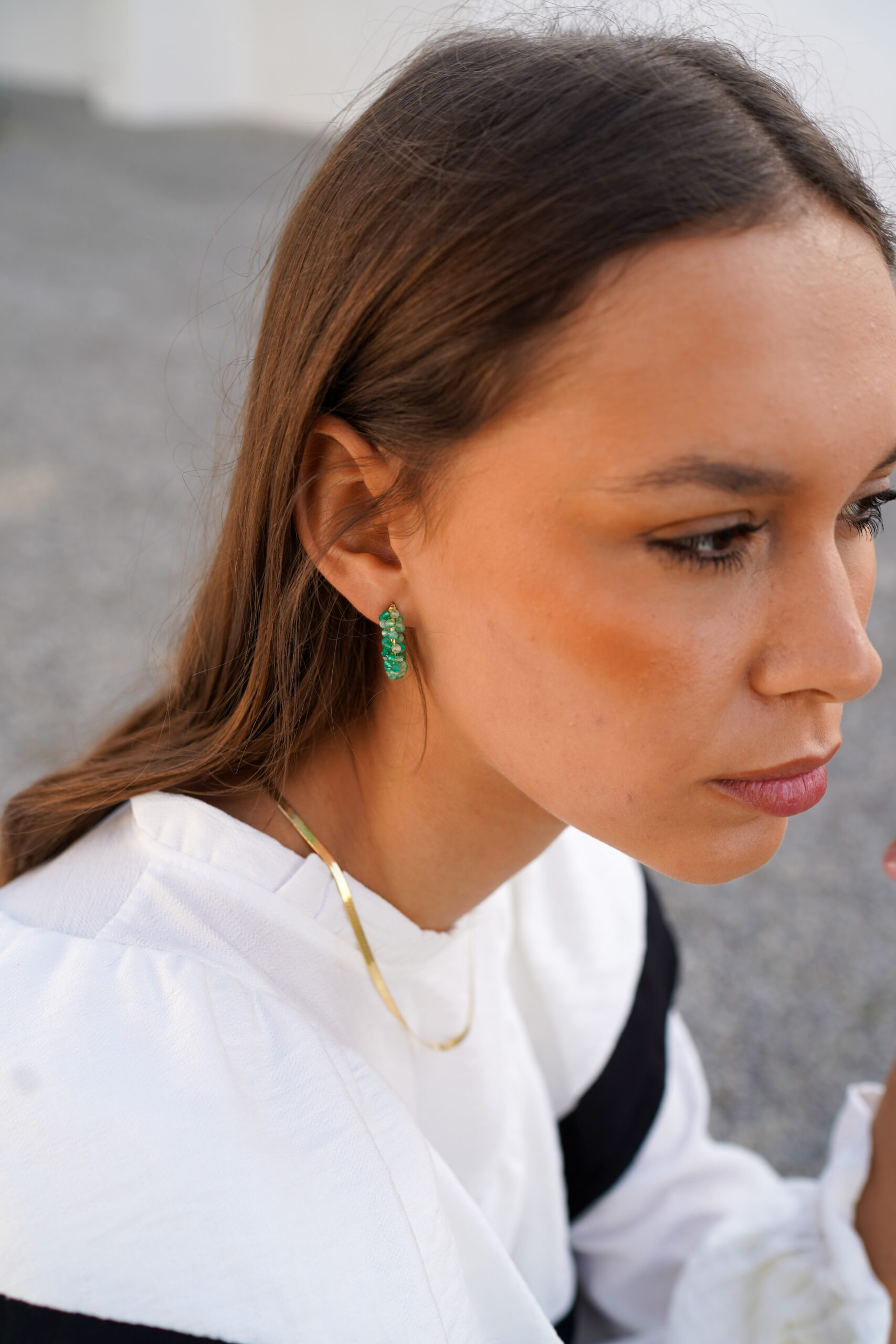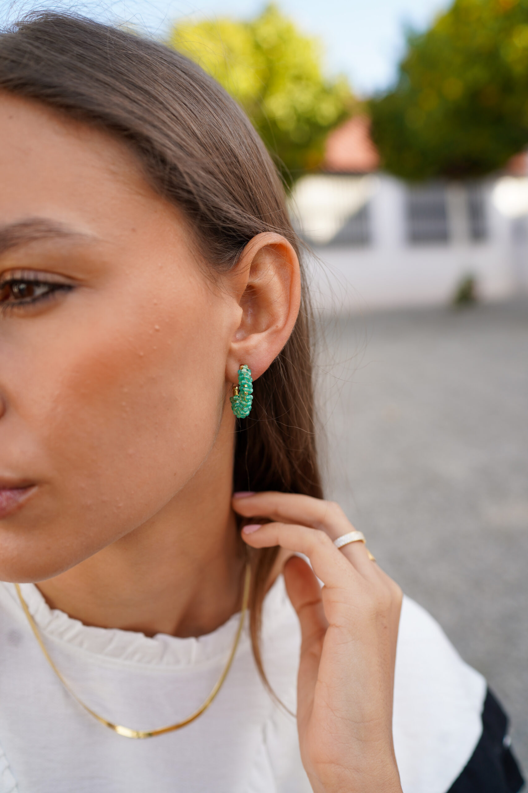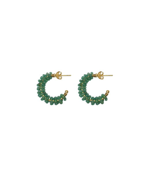Pendientes aro en plata de ley chapado en oro cubierto en espiral por mini piedras de aventurina verde natural.