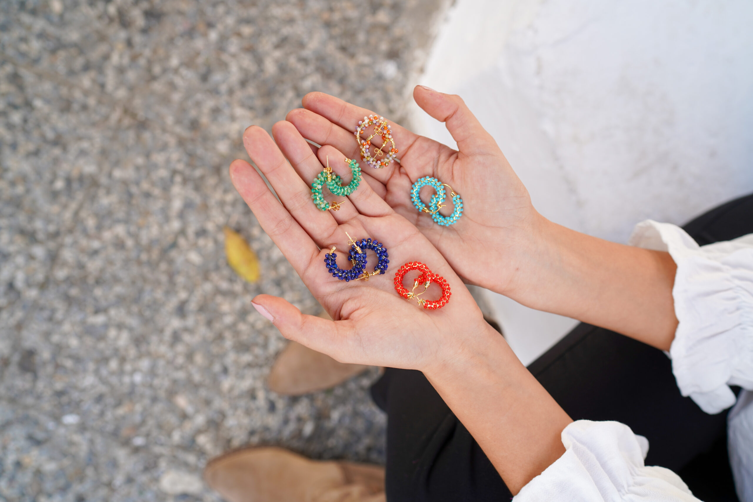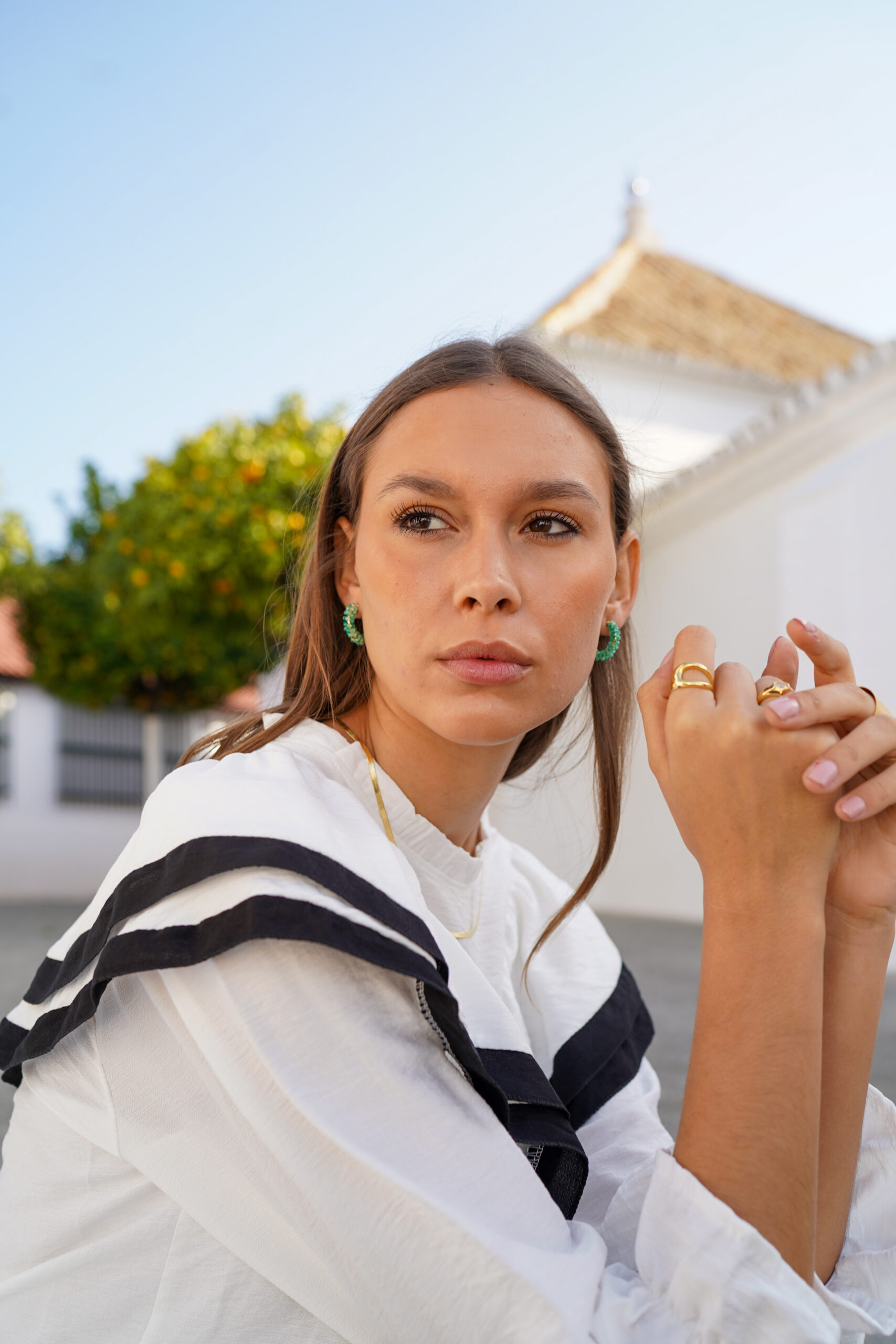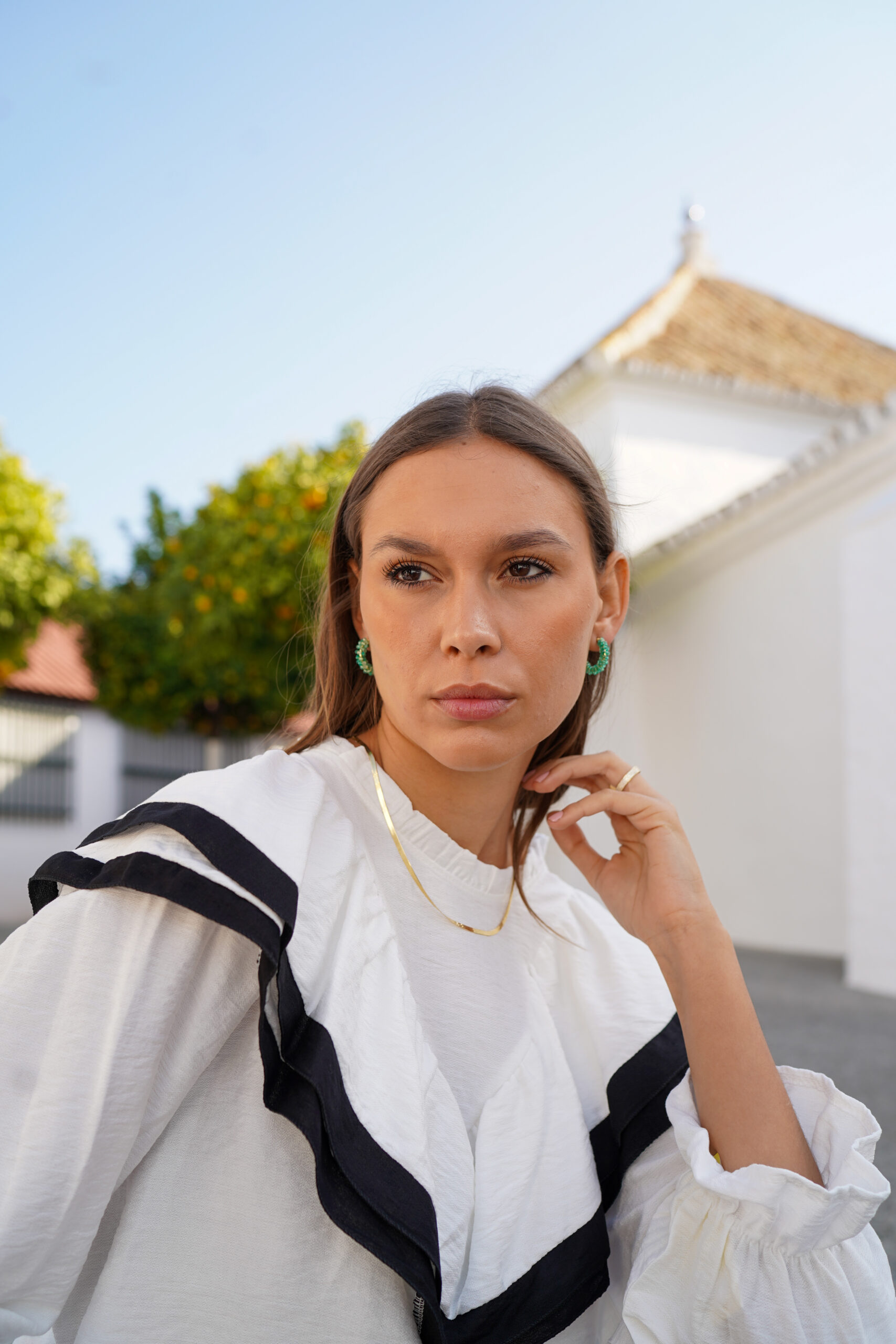 Pendientes aro en plata de ley chapado en oro cubierto en espiral por mini piedras de aventurina verde natural.