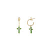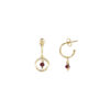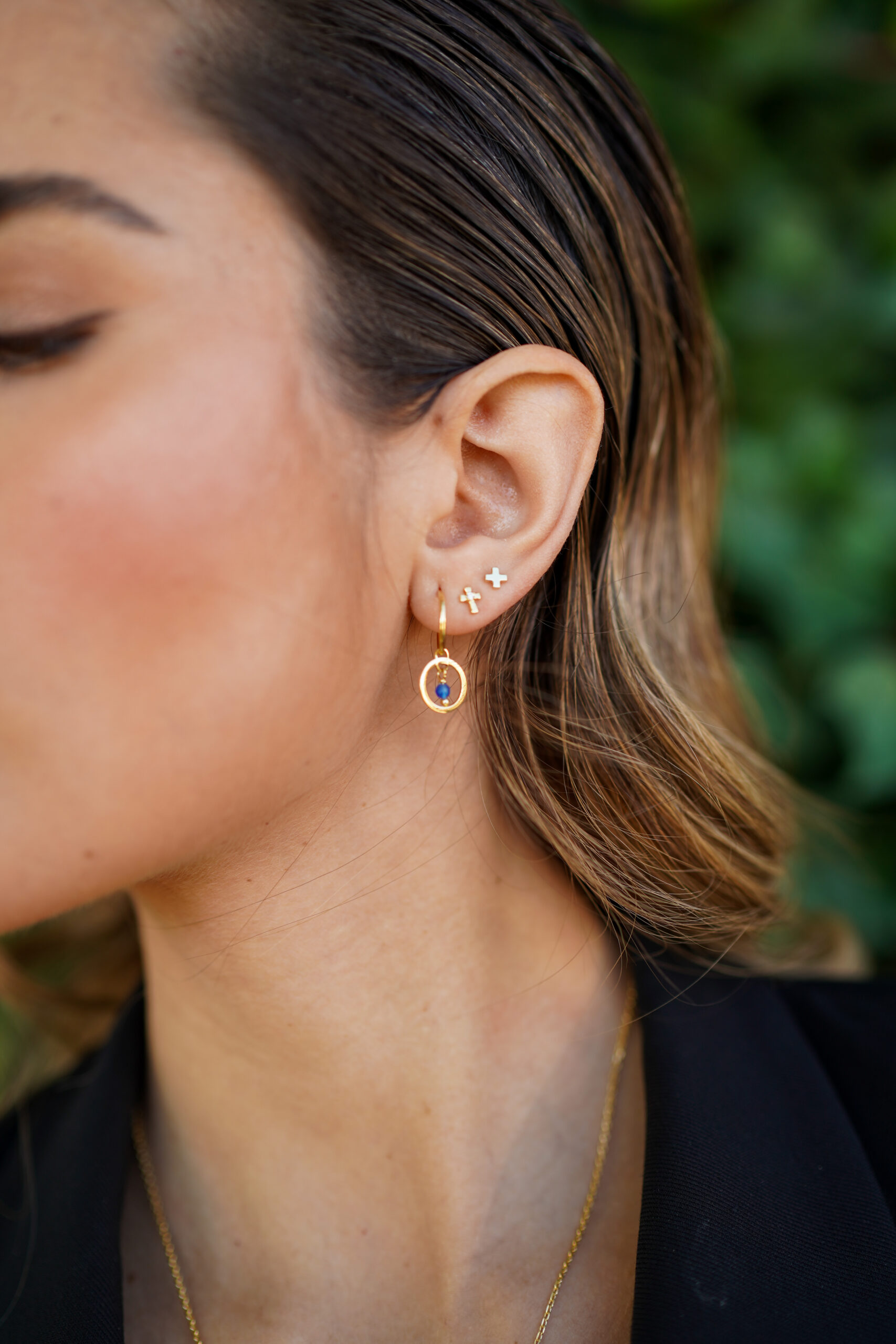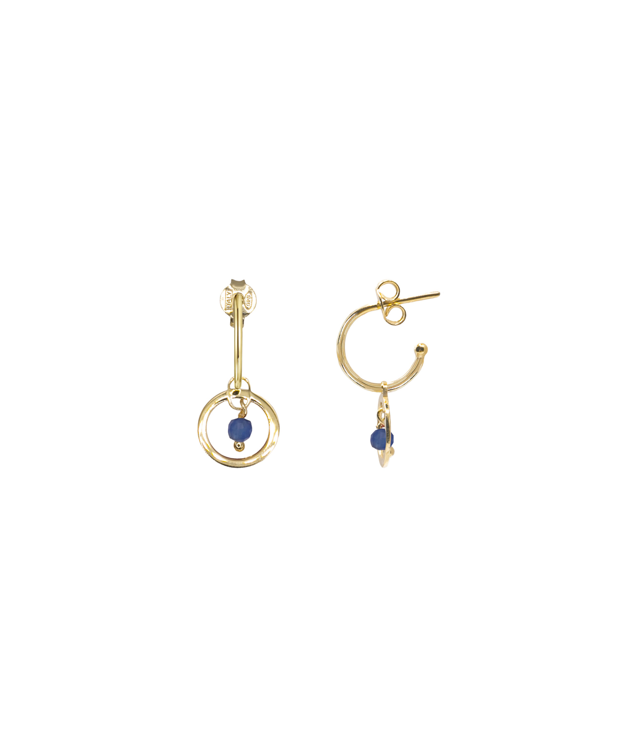 Pendientes aros en plata de ley chapado en oro con un colgante en forma de círculo calado y una piedra ágata azul natural central.
