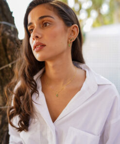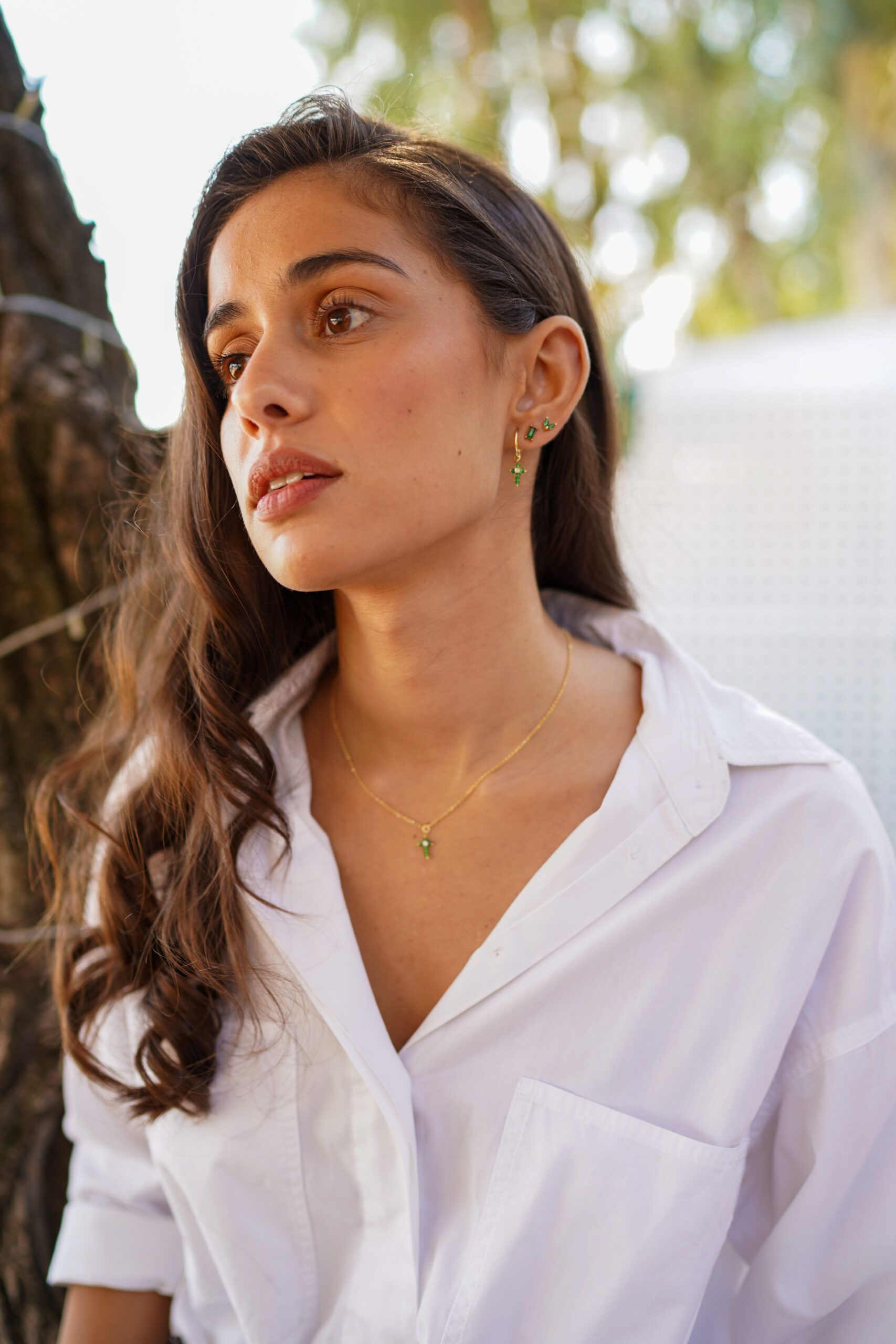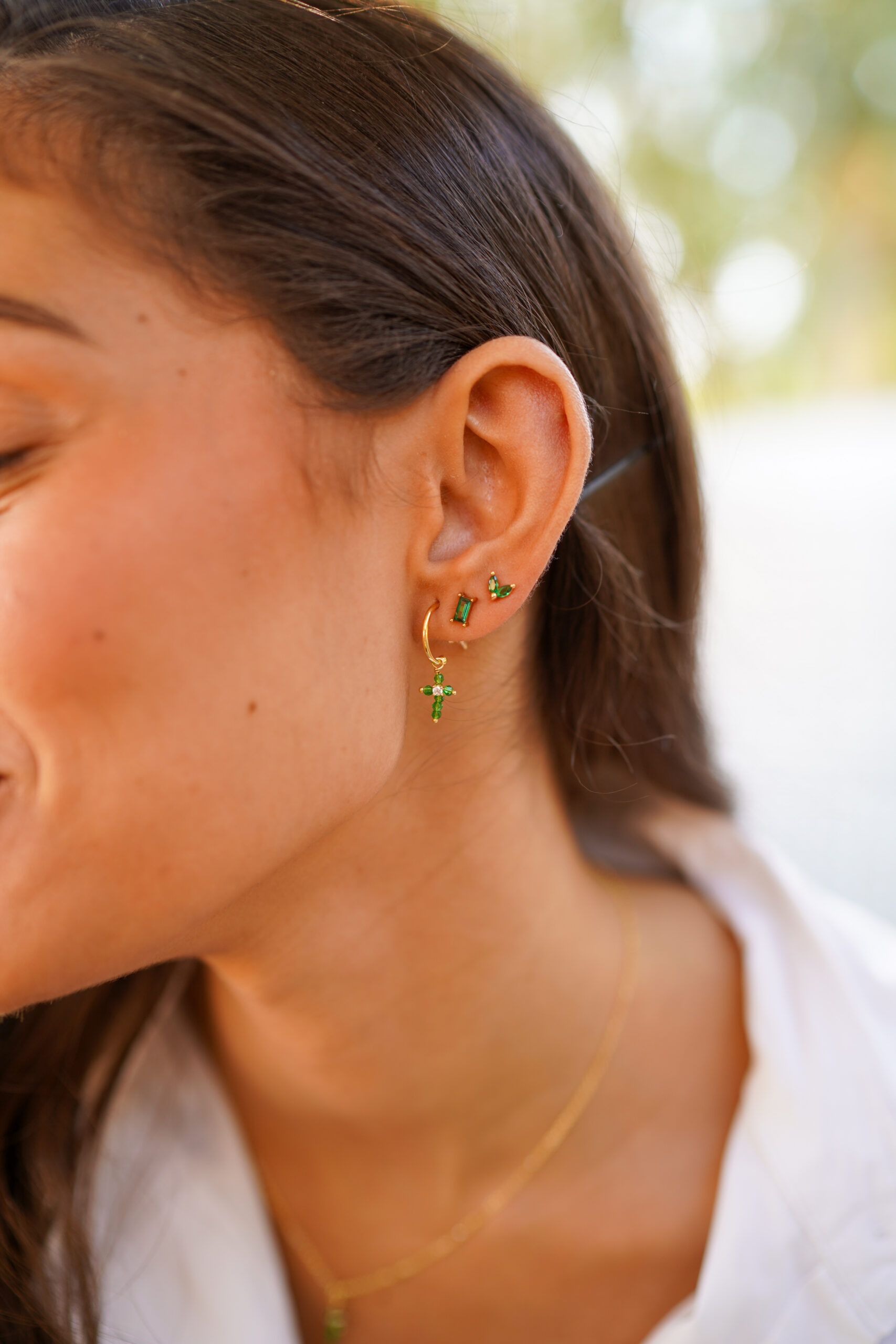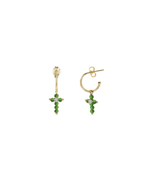 Pendientes aros en plata de ley chapado en oro con una cruz de piedras ágata verde natural colgando.