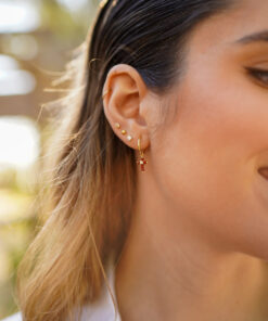 Pendientes aros en plata de ley chapado en oro con una cruz de piedras granate natural colgando