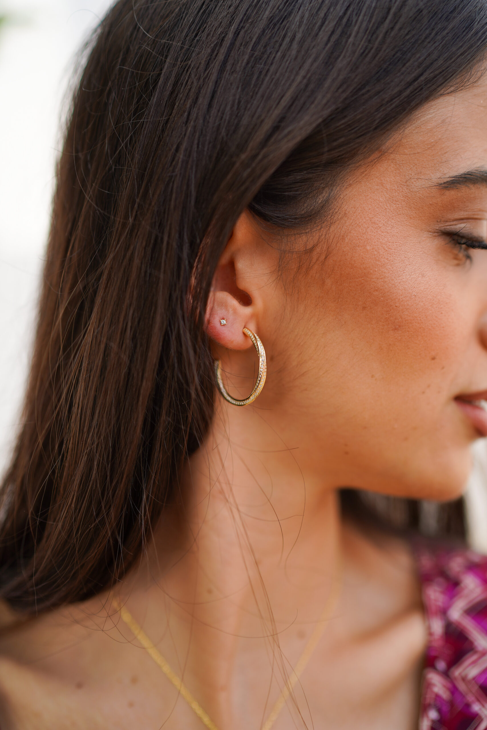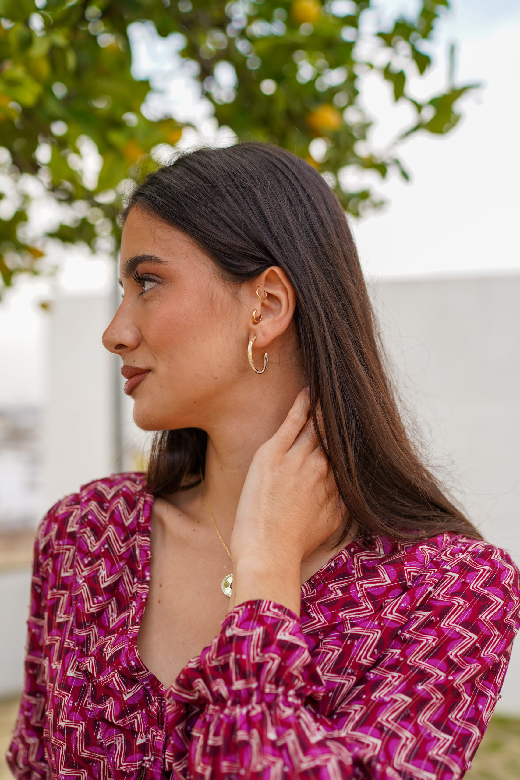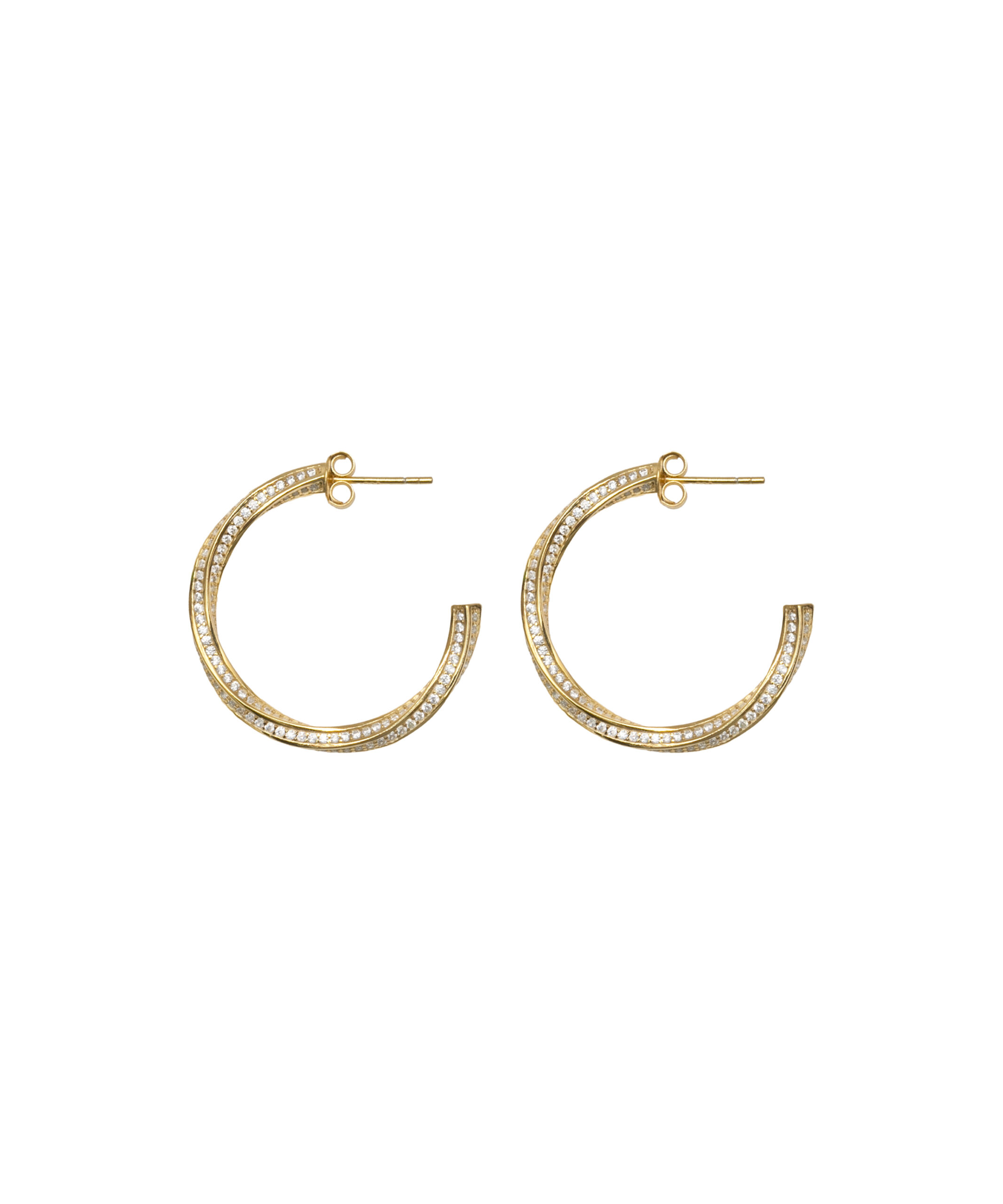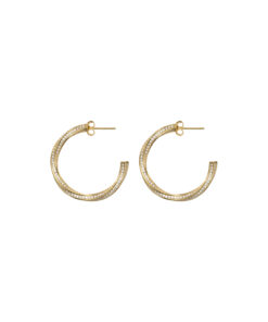 Pendiente aro de 29 mm elaborado en plata de ley chapada en oro y circonitas, con un diseño trenzado que aporta elegancia y un toque contemporáneo. La pieza destaca por su acabado detallado y su versatilidad, ideal tanto para ocasiones formales como para el día a día.