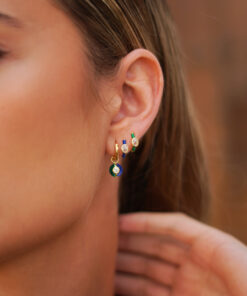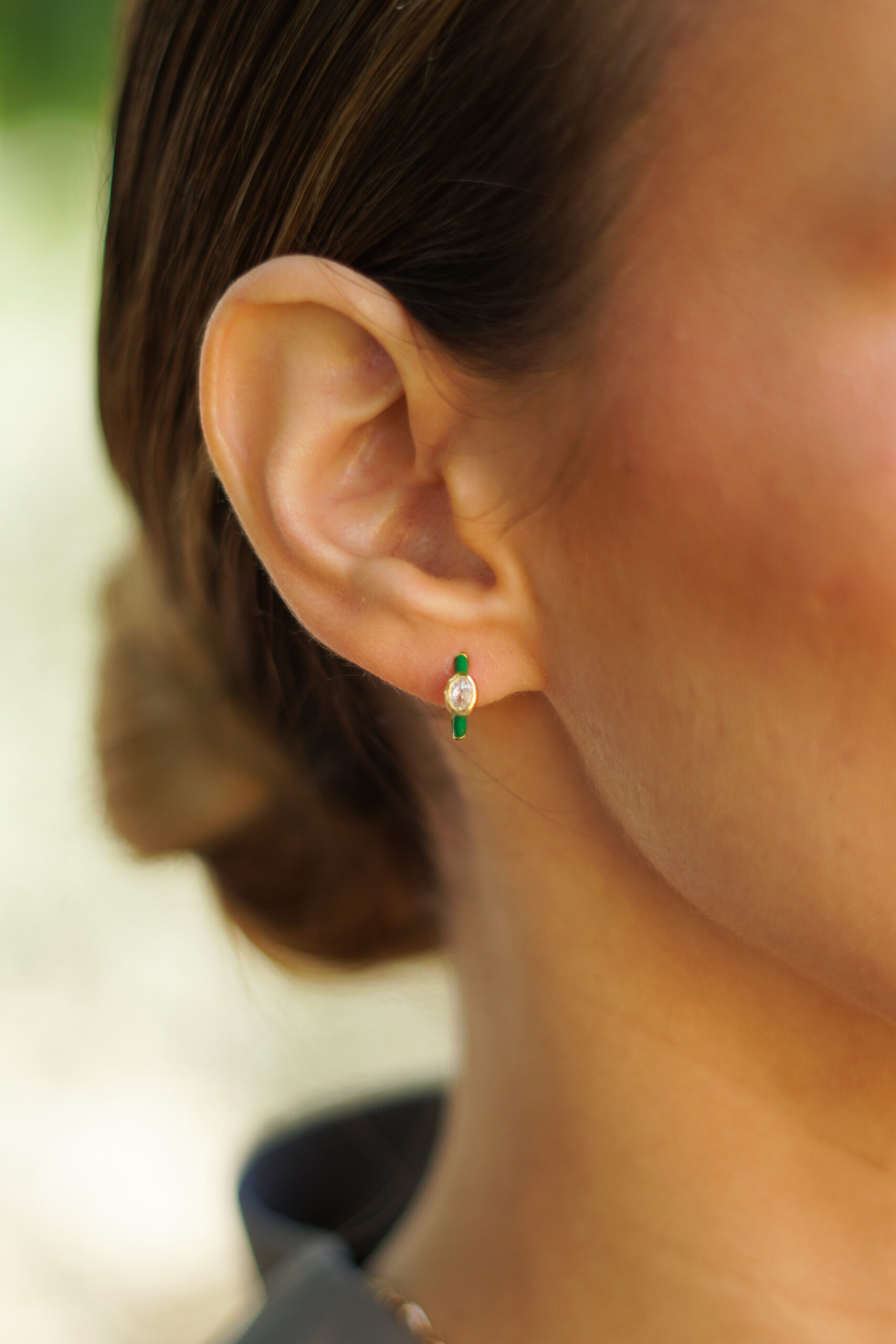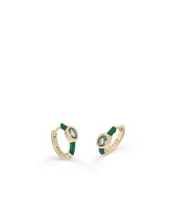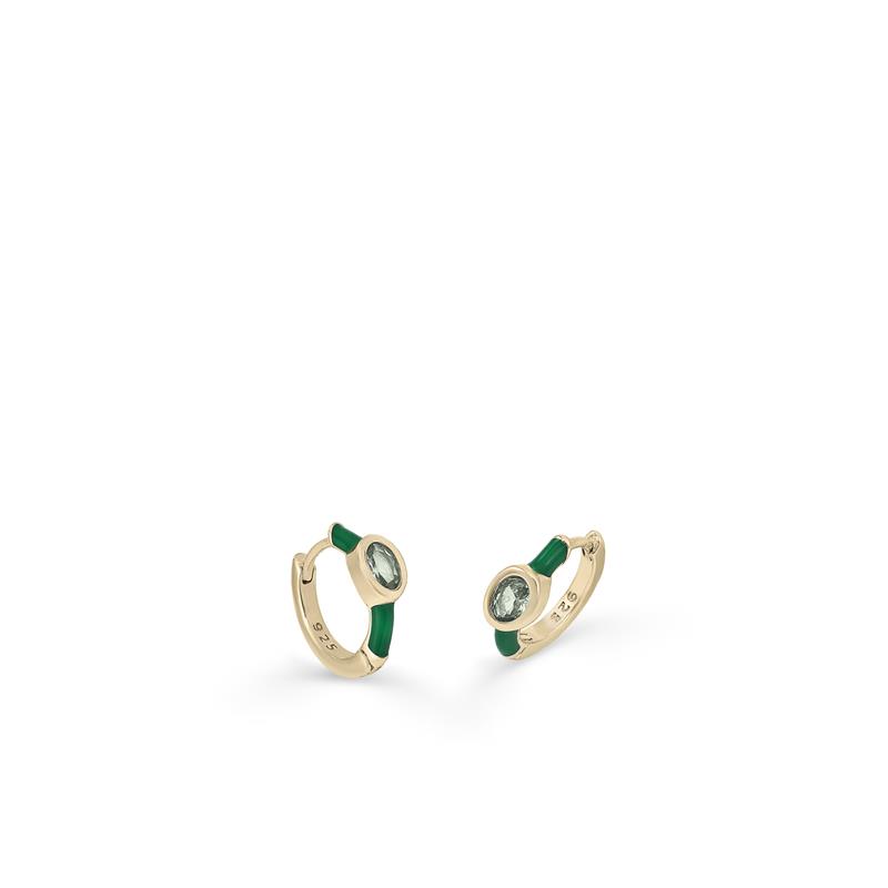 Pendientes aros en plata de ley chapados en oro con esmalte verde y circonita oval en el centro.