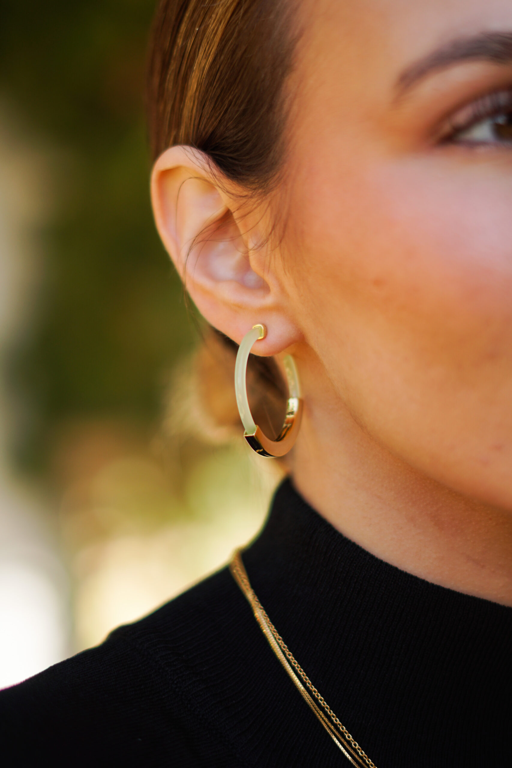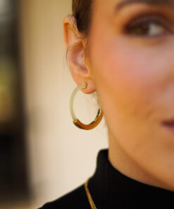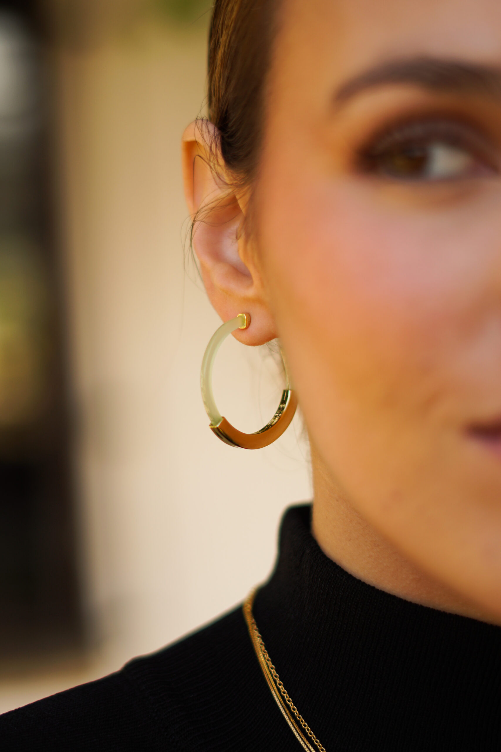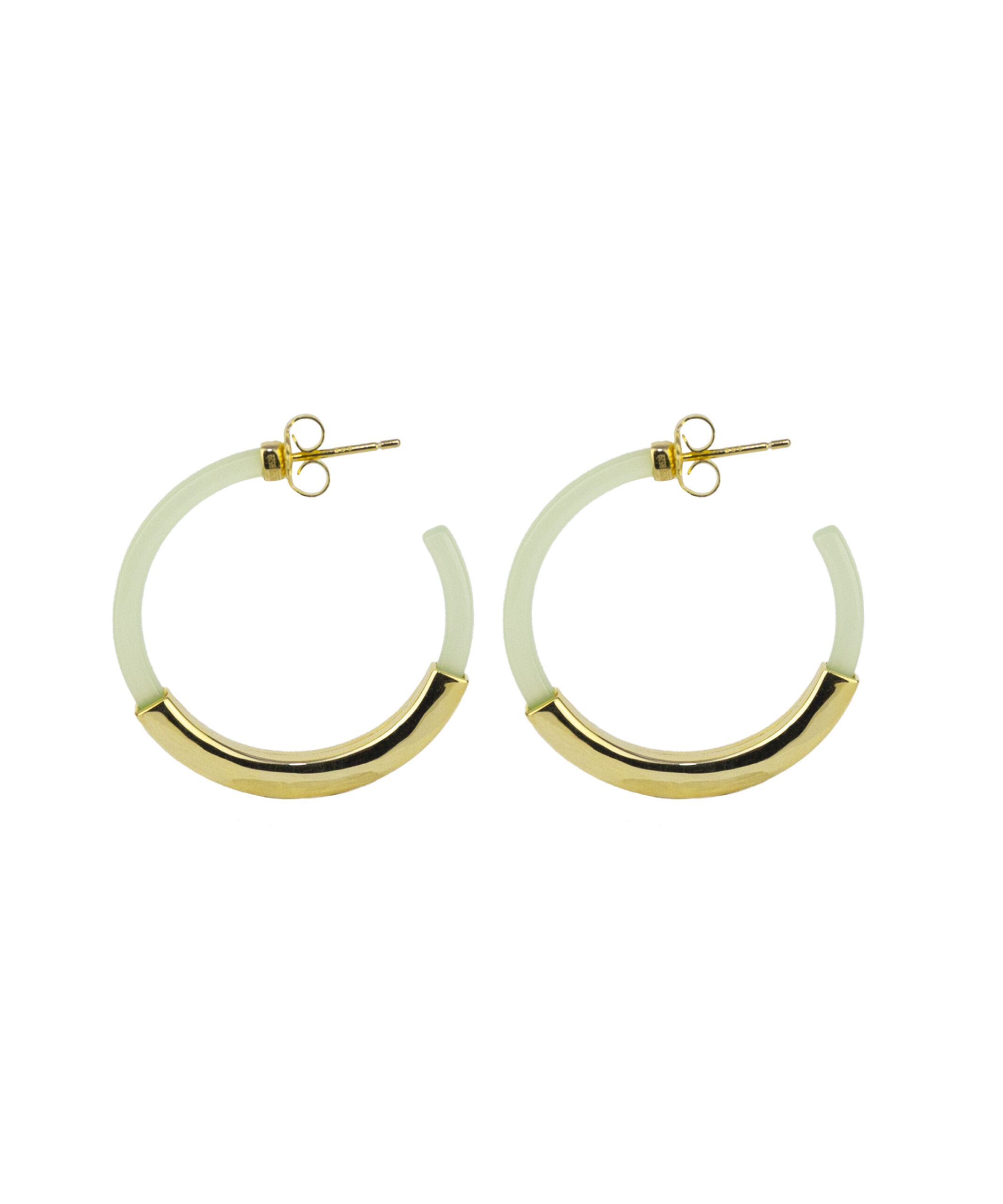 Pendientes aros en plata de ley chapados en oro y resina color verde claro con tramo de plata liso en la parte inferior.
