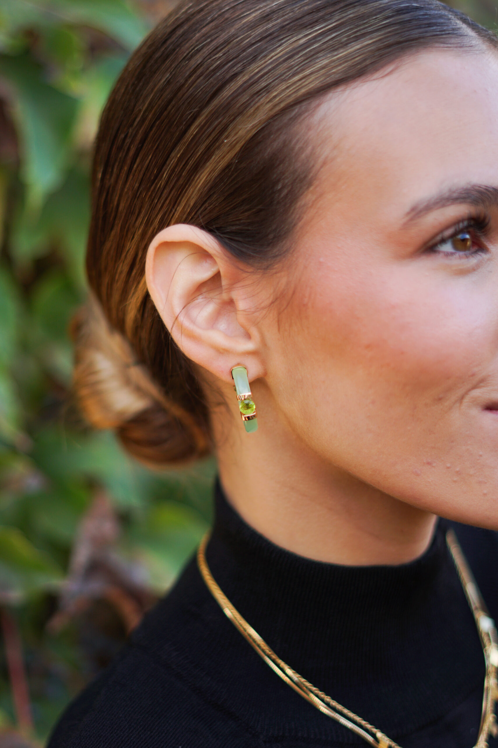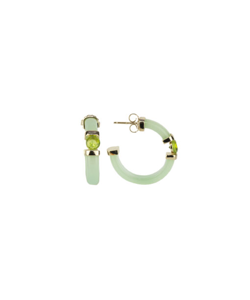 Pendientes aros en plata de ley chapados en oro y resina color verde con garra central con circonita verde.