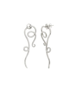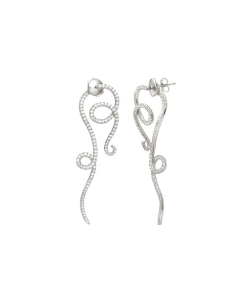 Destaca con estos impresionantes pendientes de plata de ley, dividido en dos piezas, diseñados en un estilo asimétrico único. Su forma de espirales elegantes y fluidas está adornada con delicadas circonitas, que aportan un brillo deslumbrante a cada movimiento.