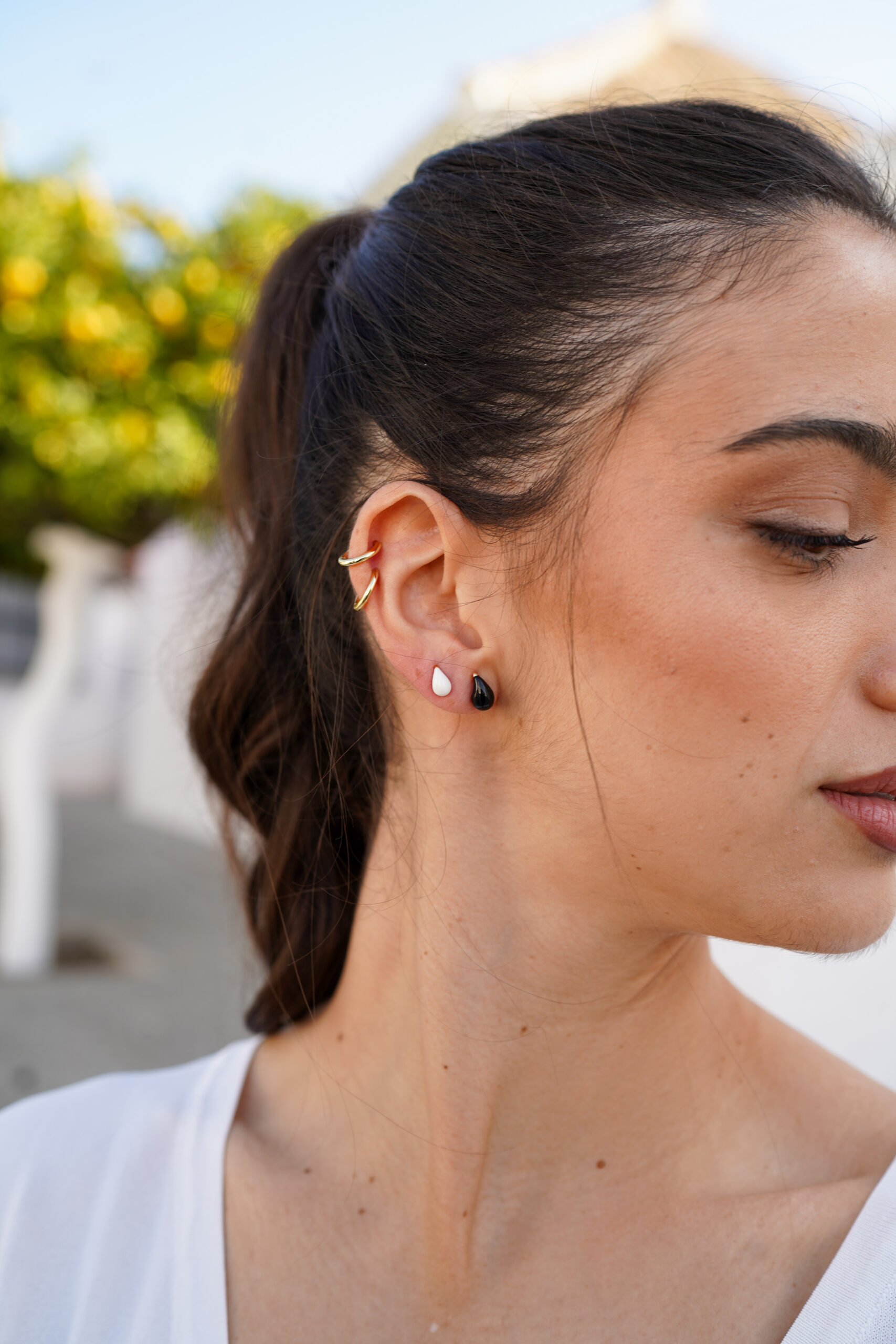 Pendiente mini en plata de ley chapado en oro con forma de gota de esmalte blanco.