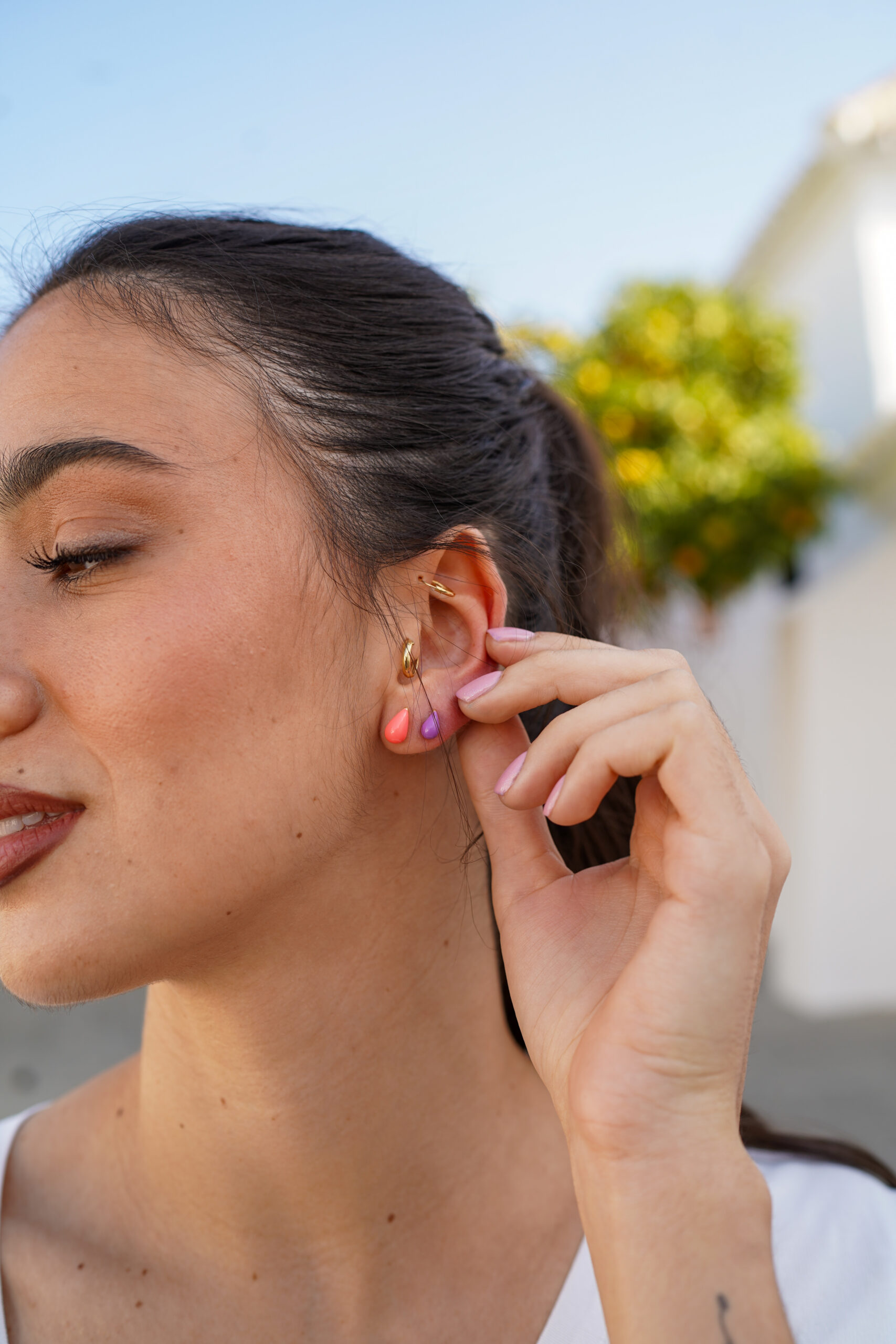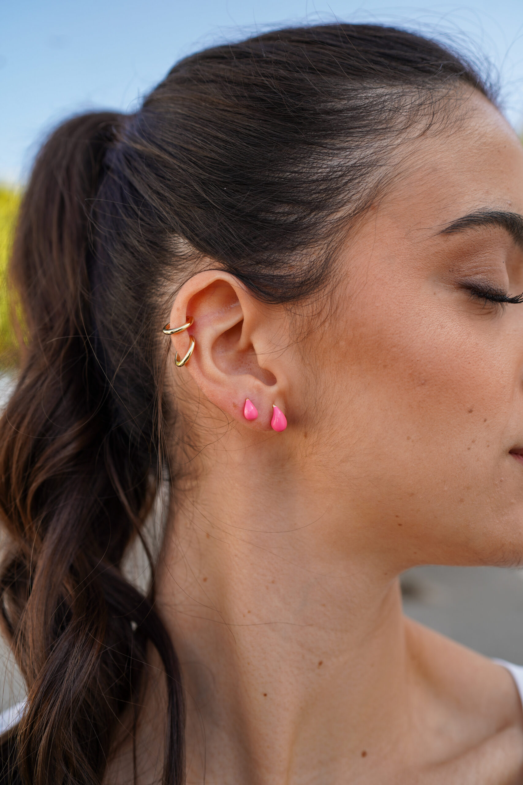 Pendiente en plata de ley chapado en oro con forma de gota de esmalte rosa.