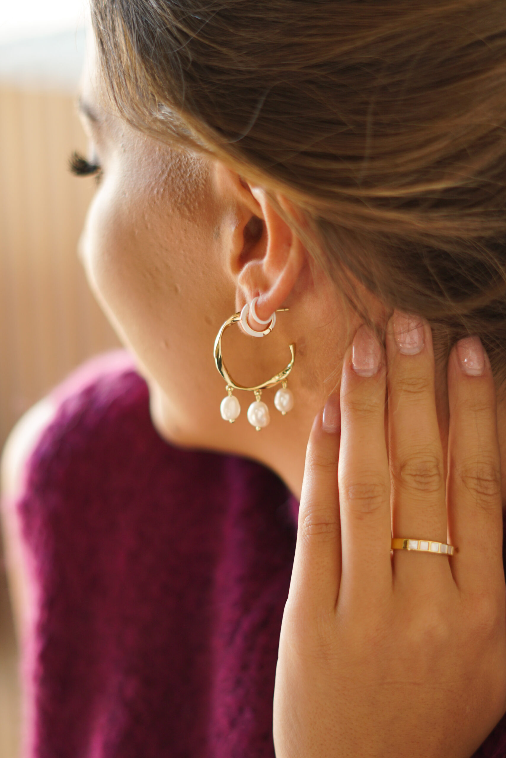 Pendiente aro mini en plata de ley chapado en oro recubierto por esmalte de color blanco.