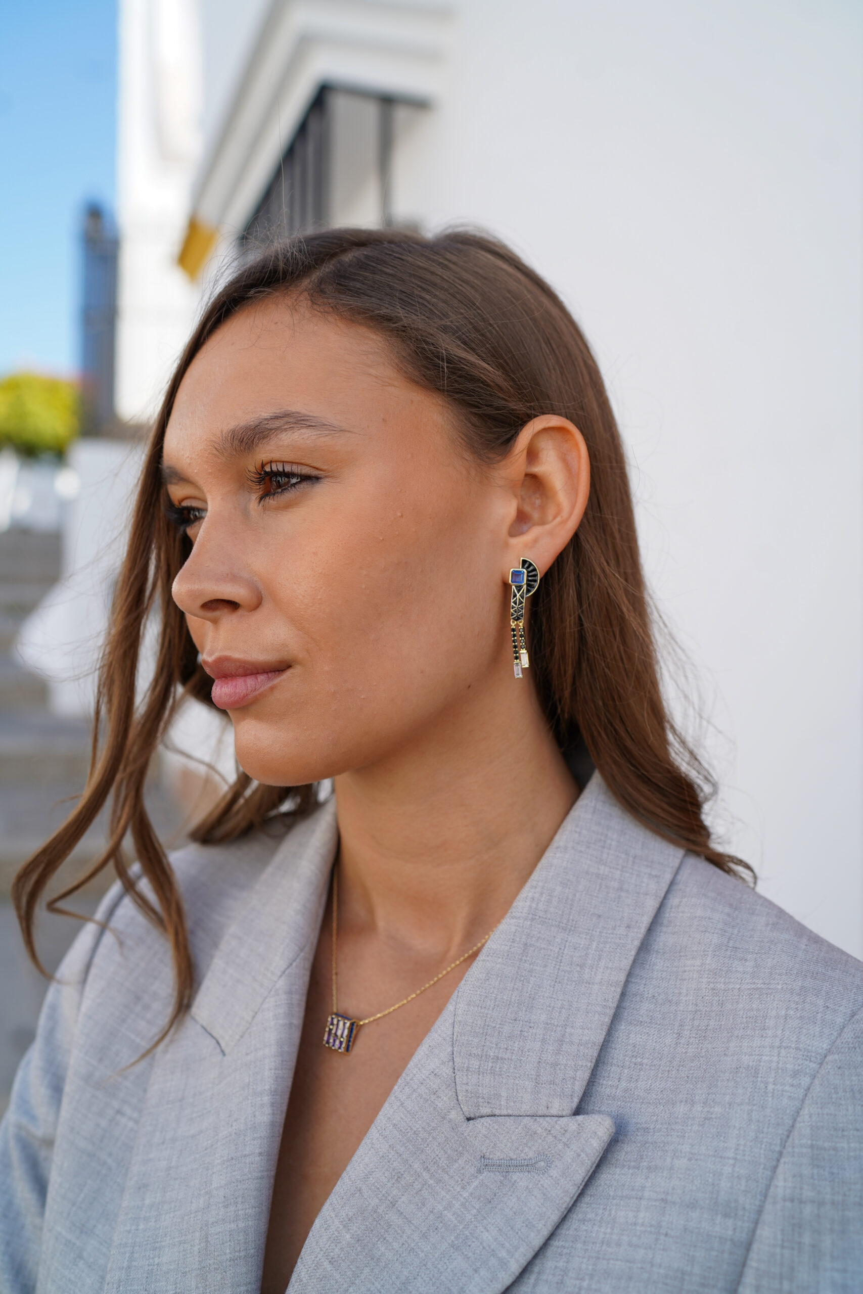Pendientes colgantes, en plata de ley chapada en oro, con un diseño audaz y artístico que combina elementos geométricos y texturizados. La pieza central está adornada con una piedra cuadrada de cuarzo adamantino, rodeada de detalles en esmalte negro que resaltan su intensidad. El diseño se complementa con delicados colgantes de cuentas negras y cristales alargados que aportan movimiento y elegancia. Este accesorio único es ideal para destacar en cualquier ocasión especial.