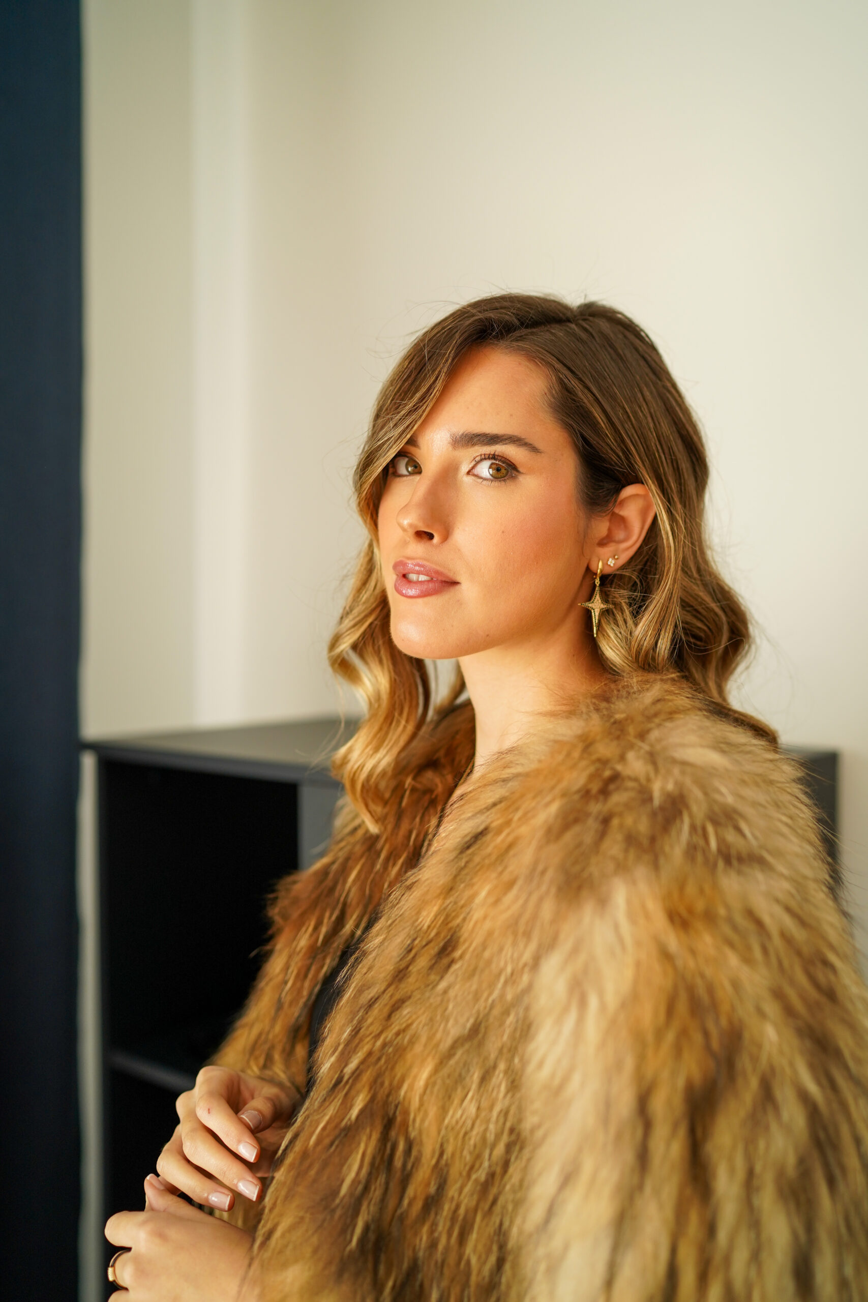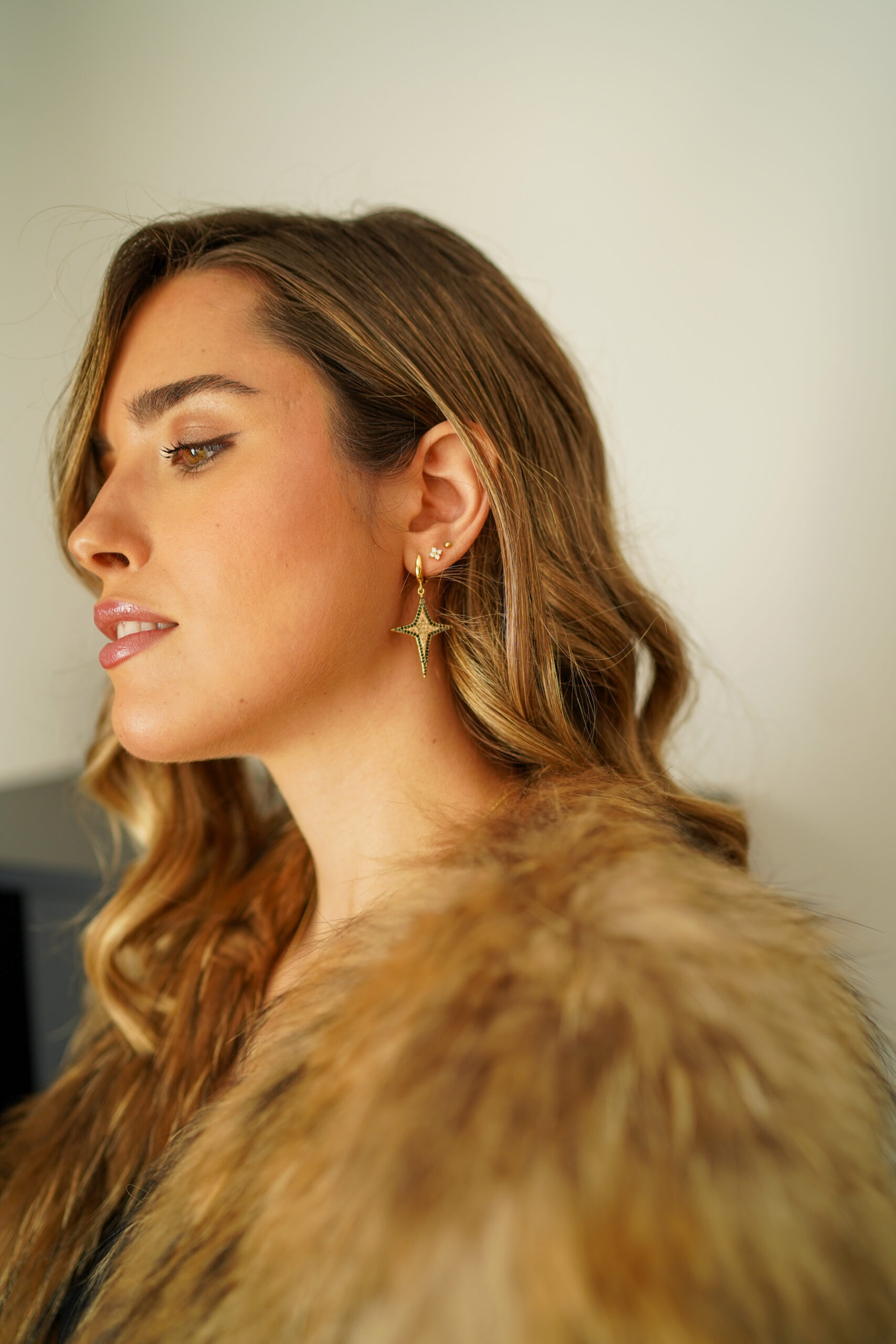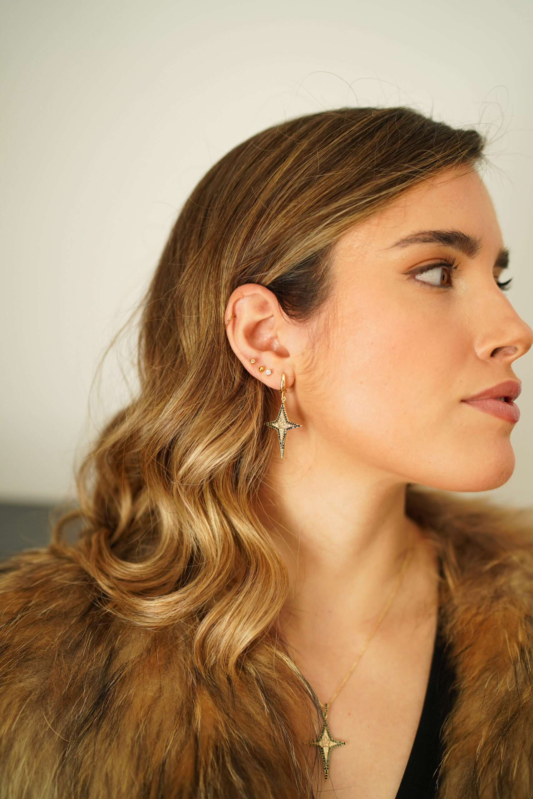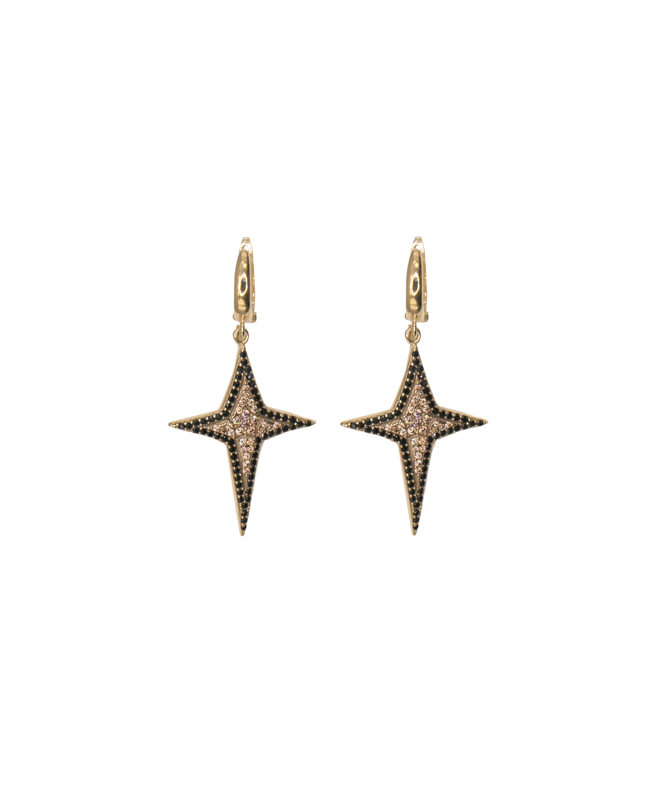 Pendientes en plata de ley chapados en oro en forma de estrella de cuatro puntas con circonitas en color champagne y negra.