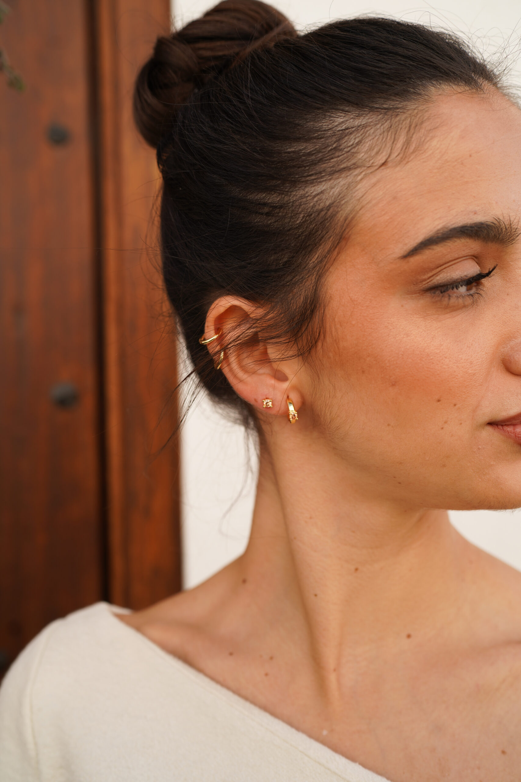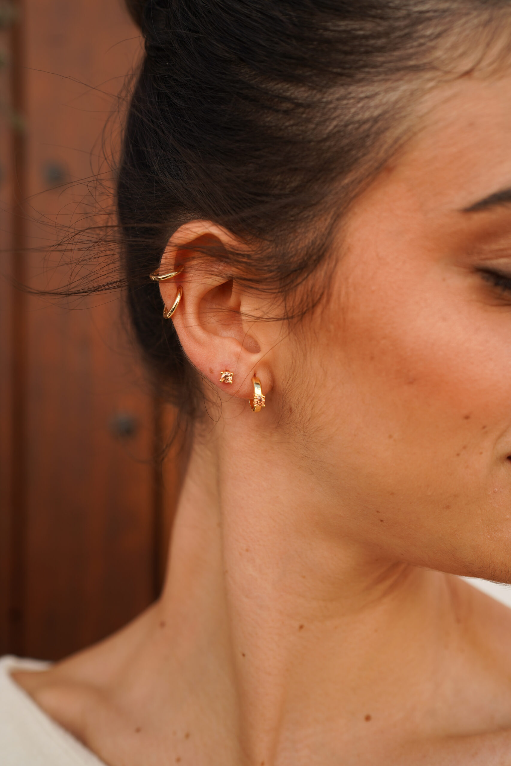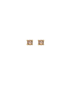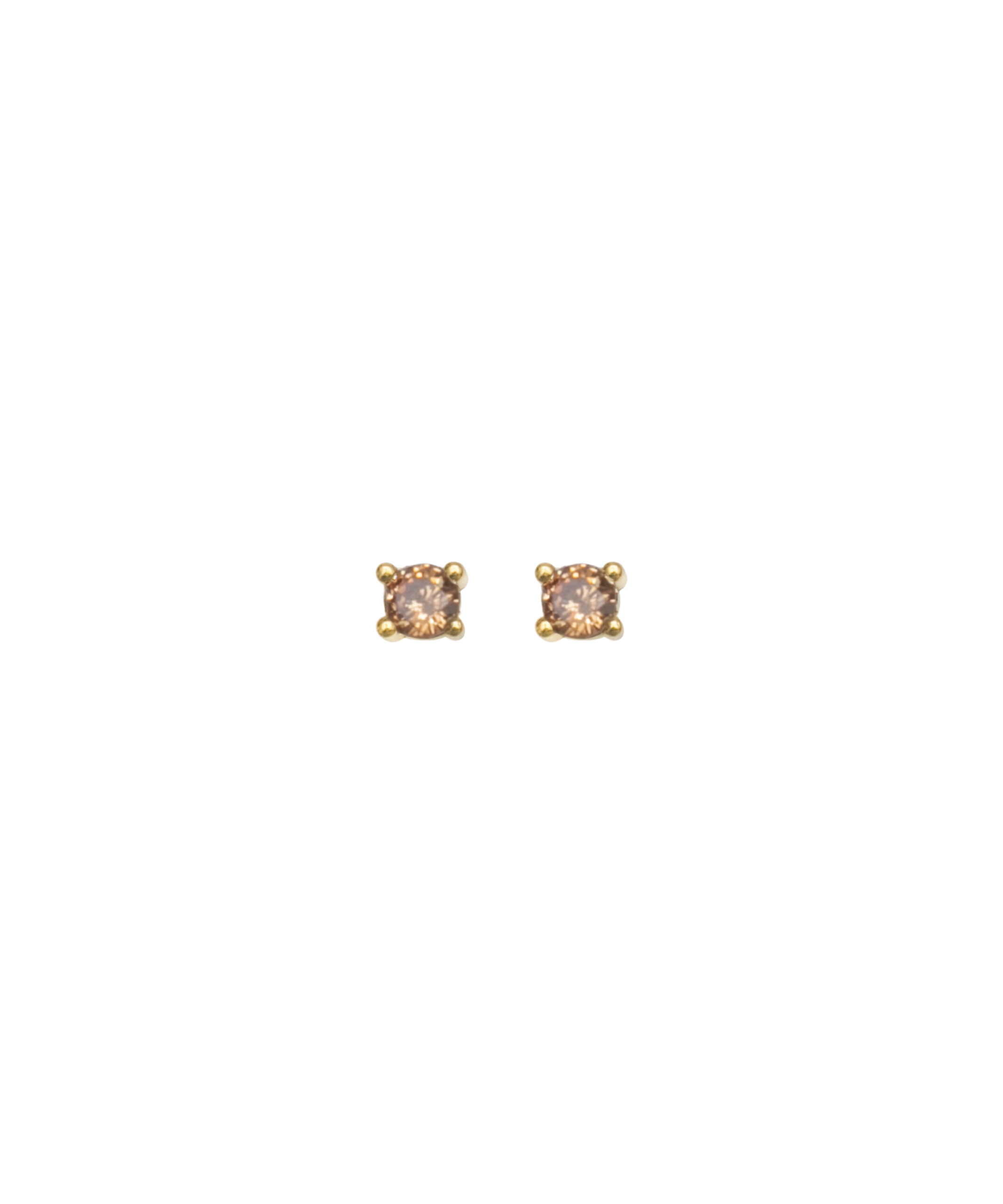 Pendientes tipo presión elaborados en plata de ley chapada en oro, con una fina montura de cuatro garras que resalta la elegancia de una circonita central color champagne de corte brillante. Un diseño clásico y atemporal, perfecto para quienes buscan un accesorio sutil pero refinado para complementar cualquier estilo.