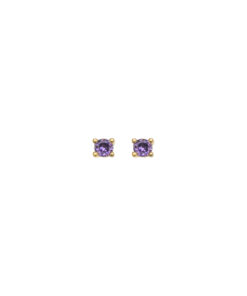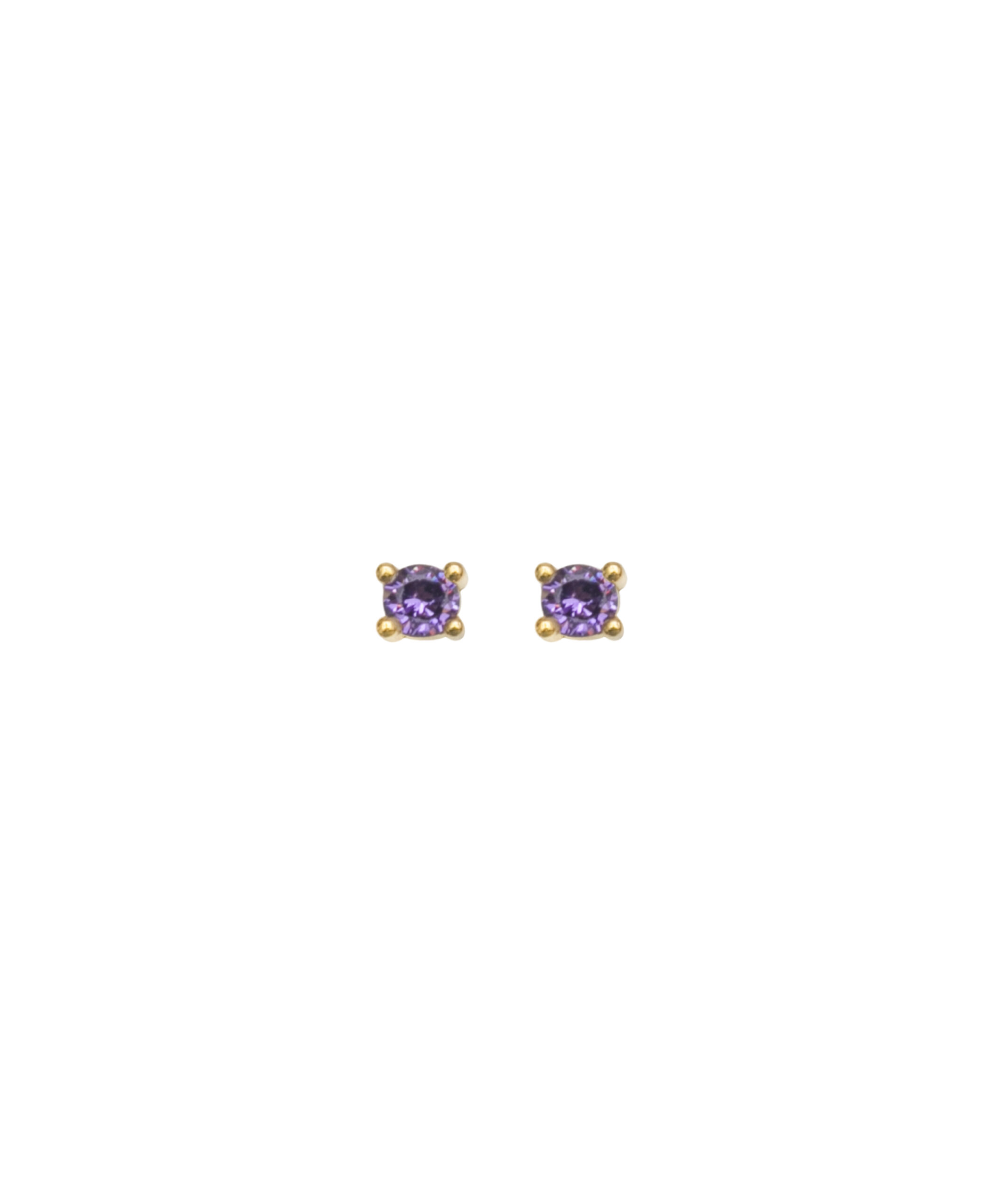 Pendientes tipo presión elaborados en plata de ley chapada en oro, con una fina montura de cuatro garras que resalta la elegancia de una circonita central color lila de corte brillante. Un diseño clásico y atemporal, perfecto para quienes buscan un accesorio sutil pero refinado para complementar cualquier estilo.
