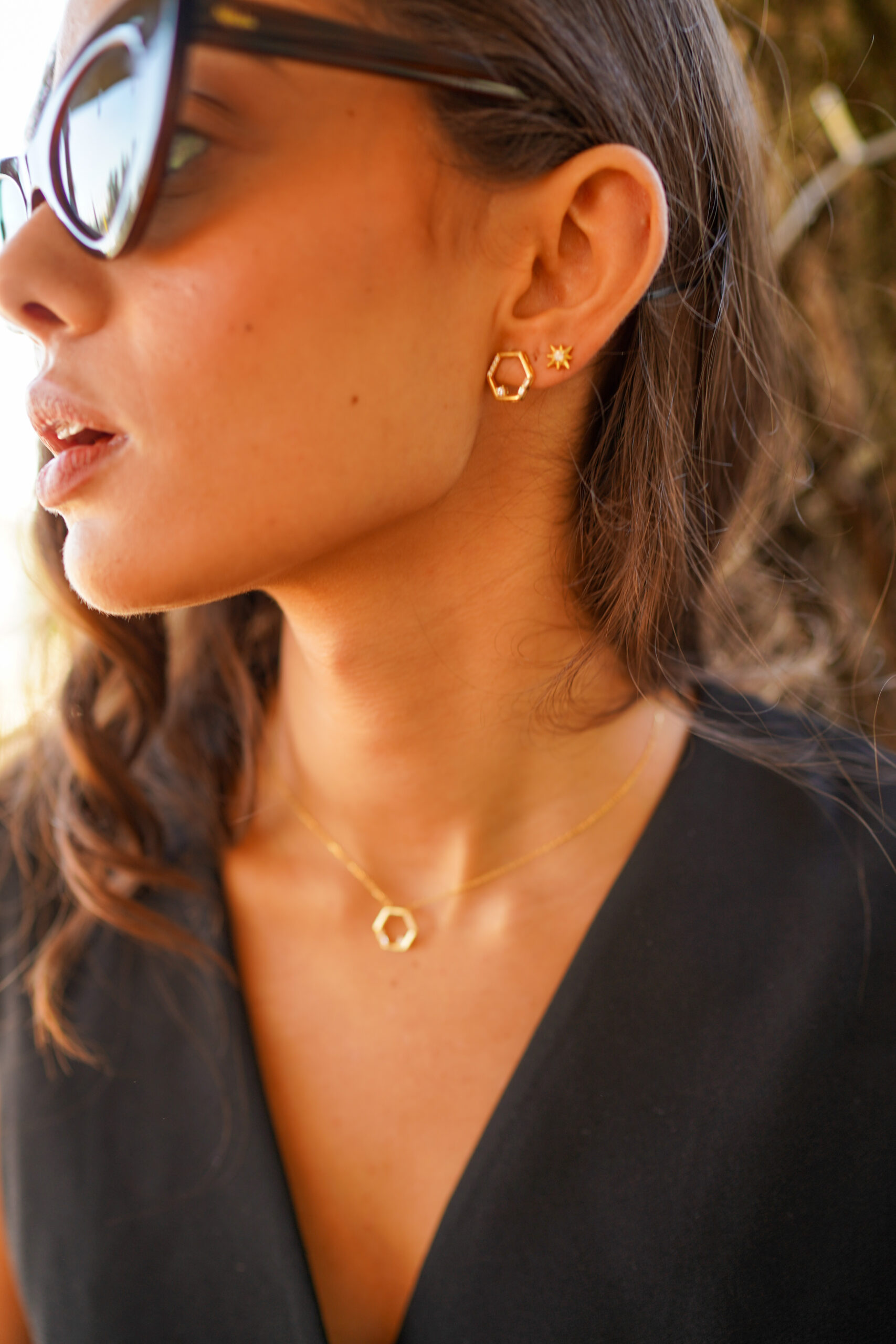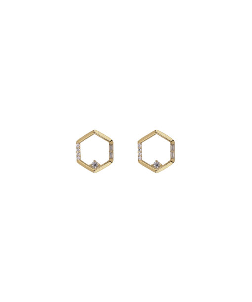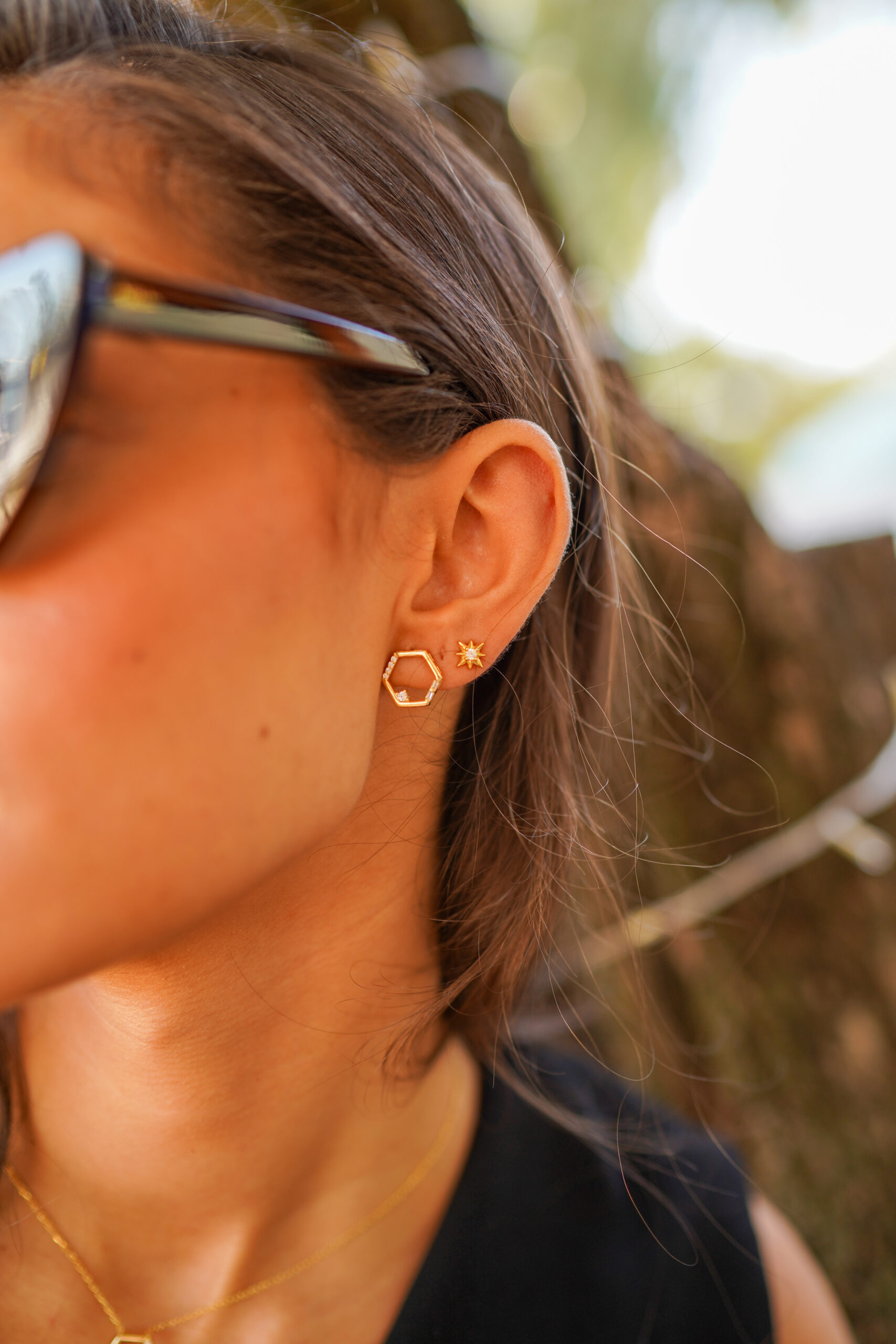 Pendientes en plata de ley chapados en oro con colgante en forma de hexágono con circonitas de diferentes formas.