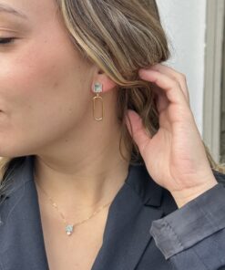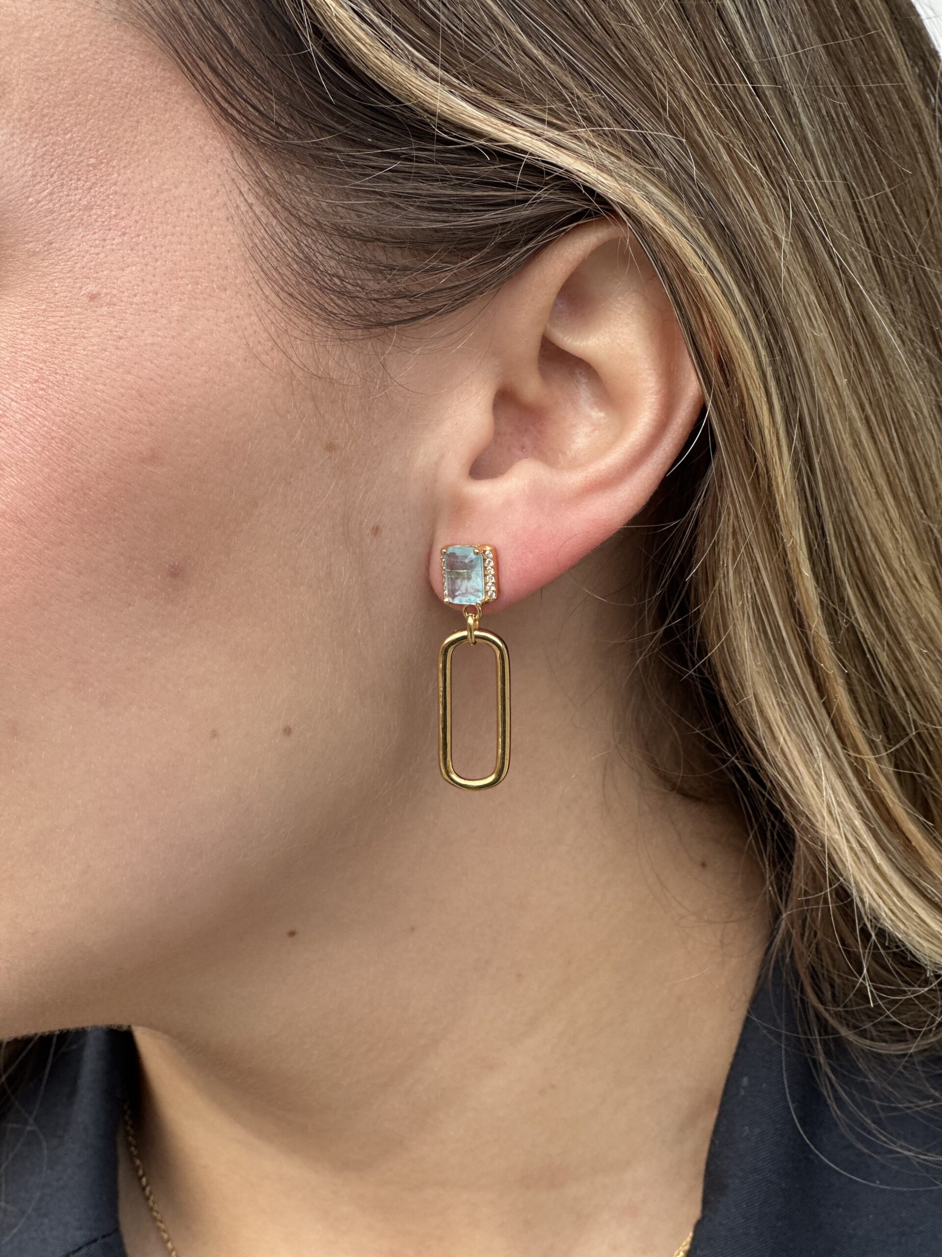 Pendientes largos de plata de ley chapada en oro con diseño geométrico y circonita, formados por una piedra central en tono agua marina engastada y un eslabón ovalado pulido que aporta movimiento y sofisticación. Su acabado luminoso y sus líneas limpias los convierten en una pieza elegante y versátil, ideal para elevar cualquier look.
