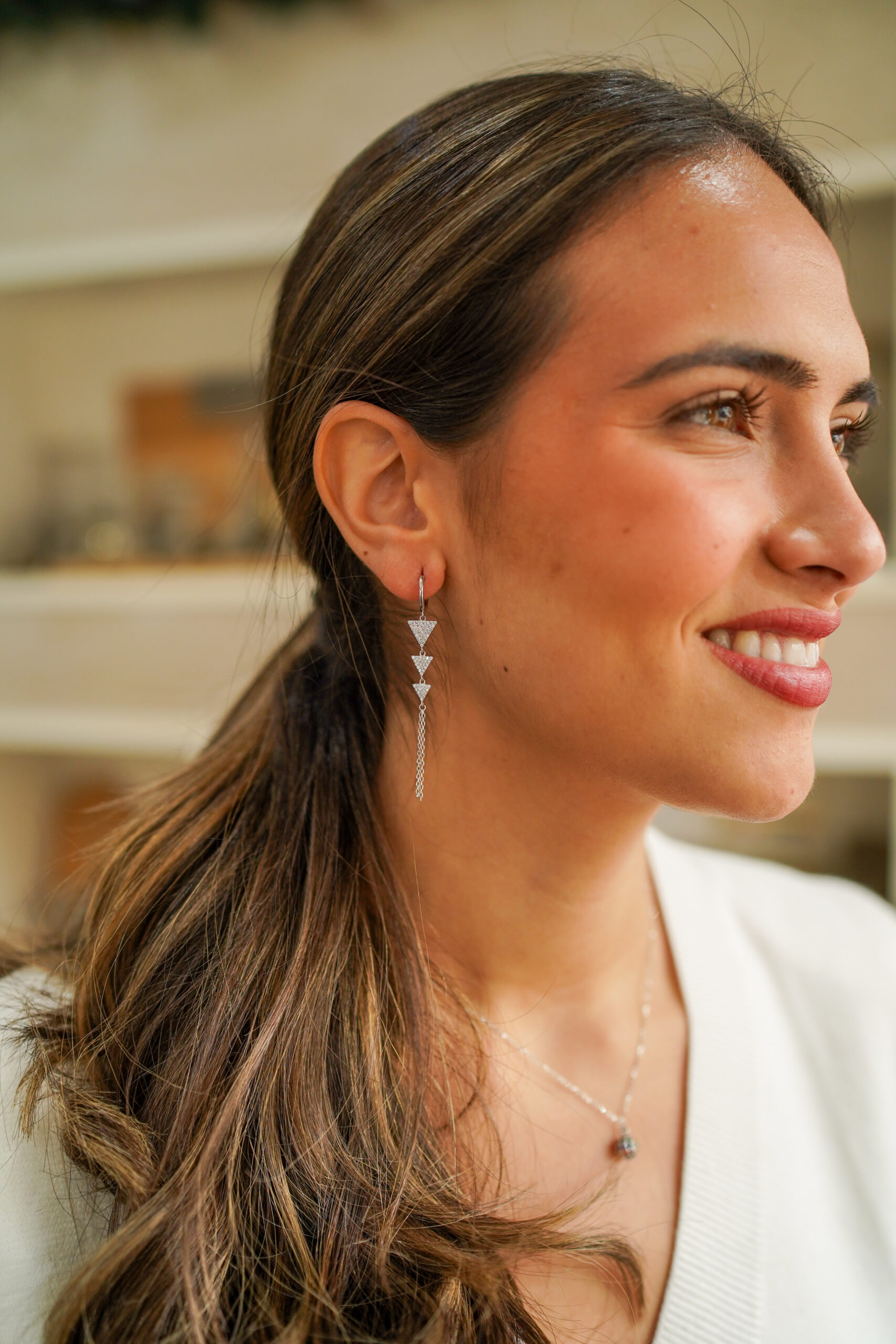 Pendientes en plata de ley, con un diseño elegante y geométrico formado por tres triángulos con pavé de circonitas que añaden un toque de luz a cada movimiento. De ellos cae una fina cadena dorada que aporta dinamismo y un efecto estilizado y sofisticado.