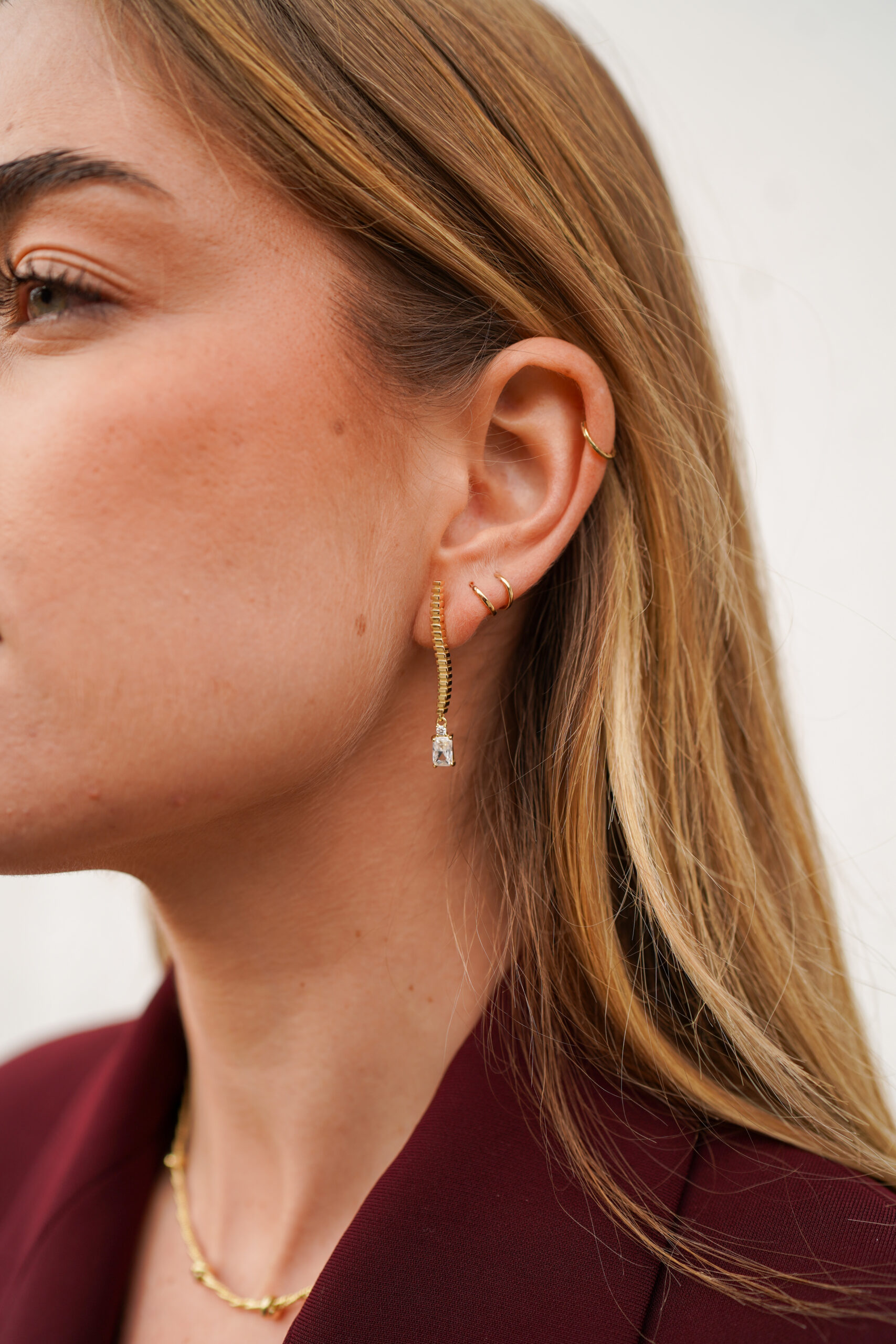Pendientes de plata de ley chapados en oro, con un diseño sinuoso y moderno que perfila una línea curva de textura geométrica, terminada en una circonita talla esmeralda que aporta un destello limpio y sofisticado. Una pieza ligera, elegante y muy actual, perfecta para elevar cualquier look con un brillo sutil y refinado.