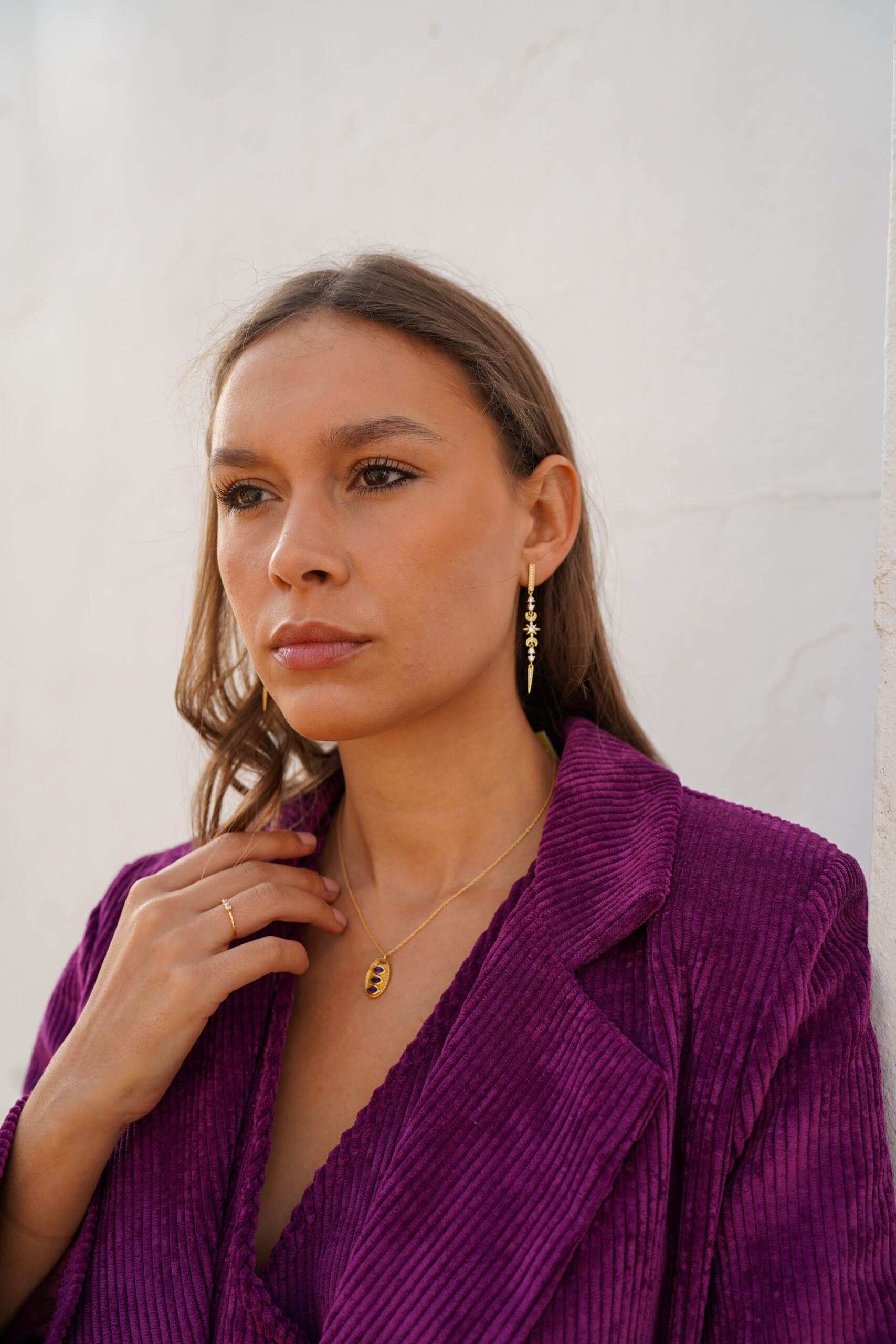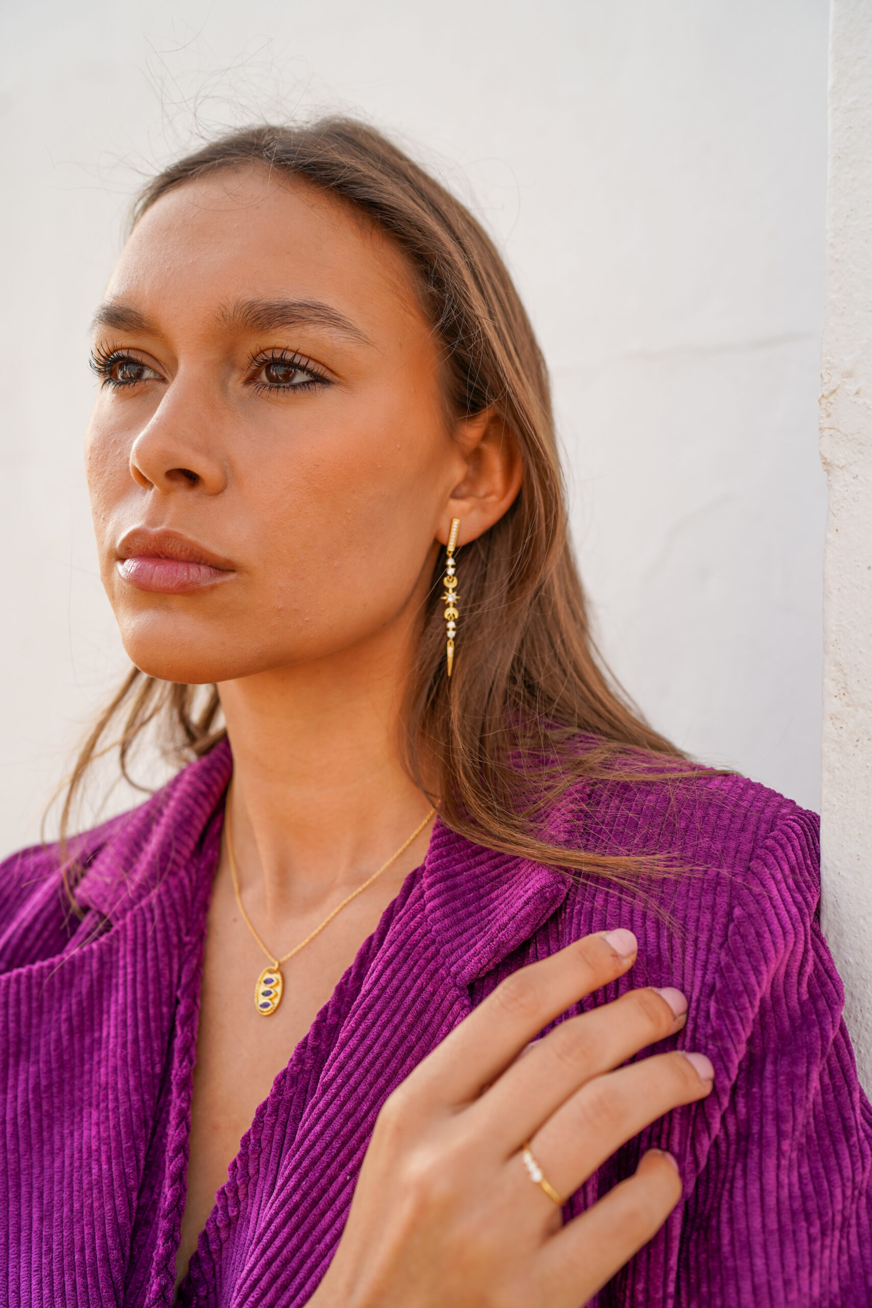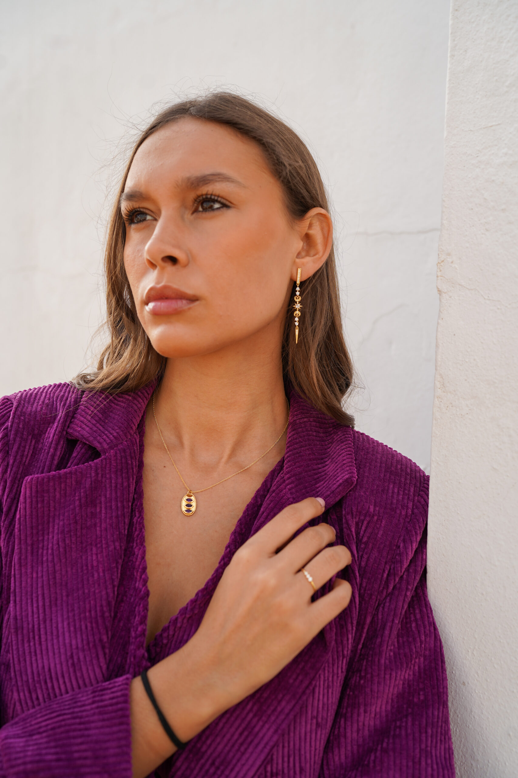 Deslumbra con estos elegantes pendientes largos de plata de ley chapada en oro, diseñados para destacar en cualquier ocasión. Inspirados en motivos celestiales, combinan estrellas, lunas y detalles geométricos delicadamente engarzados. Las circonitas de alta calidad aportan un brillo sofisticado, mientras que el diseño alargado estiliza el rostro y añade un toque glamuroso.