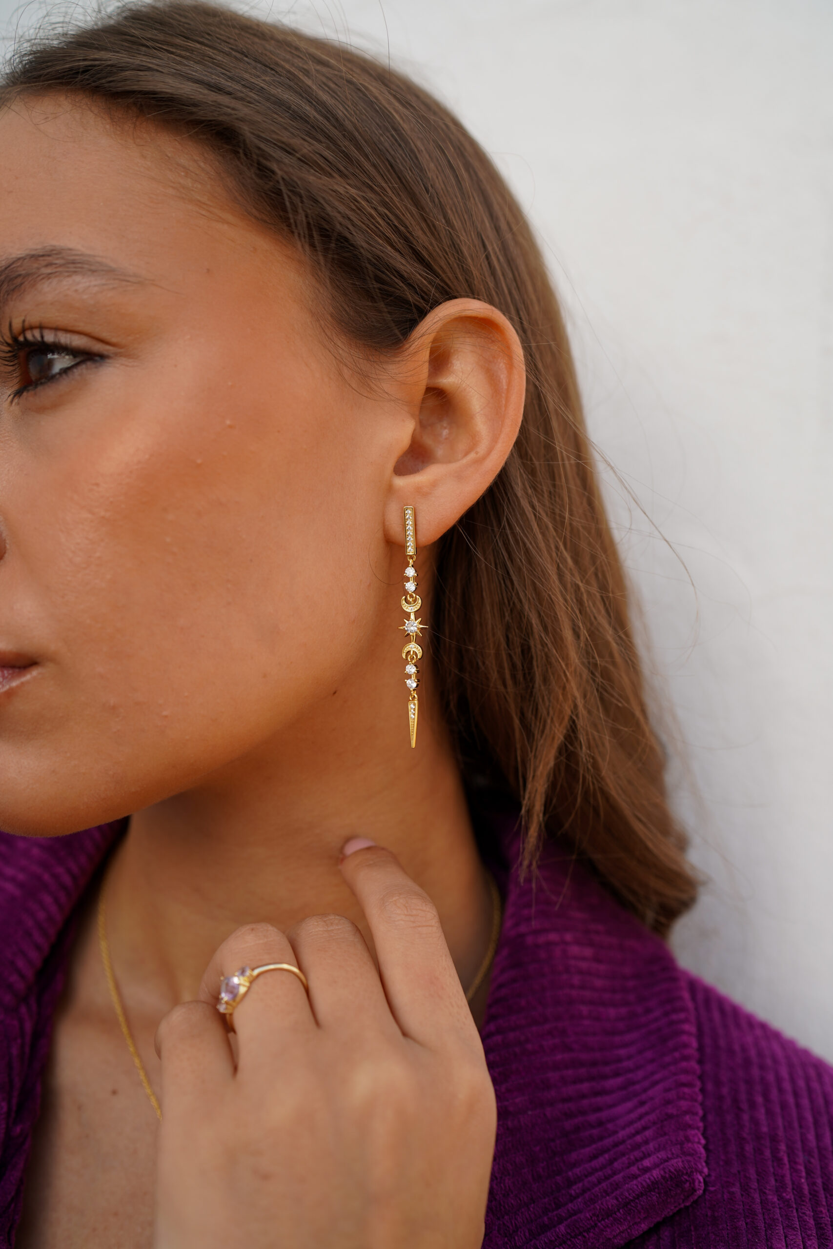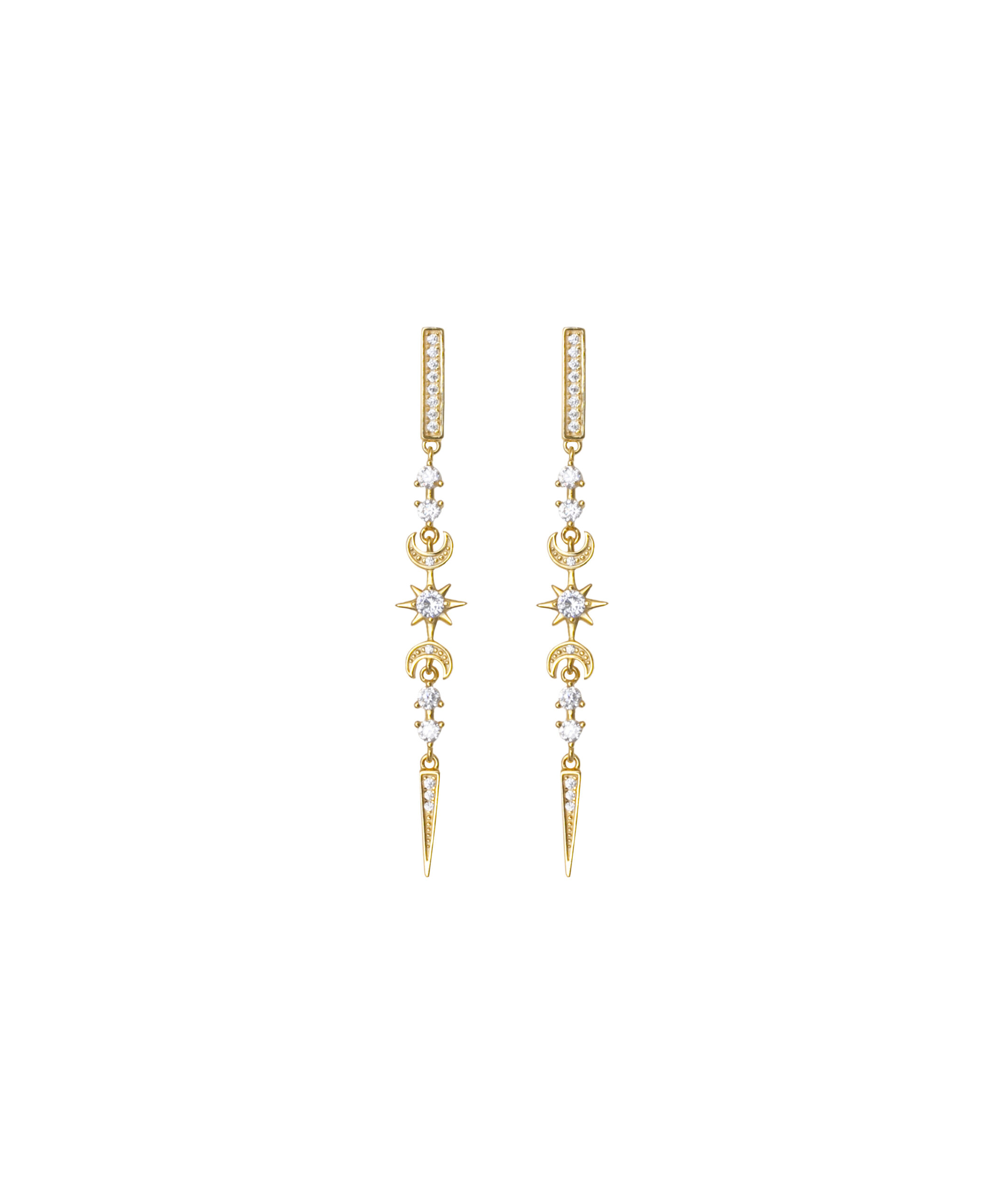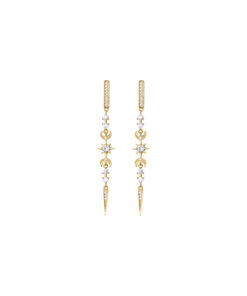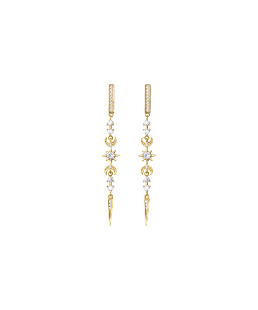 Pendientes largos de plata de ley chapada en oro con motivos celestiales y circonitas.