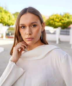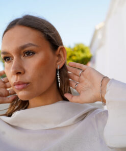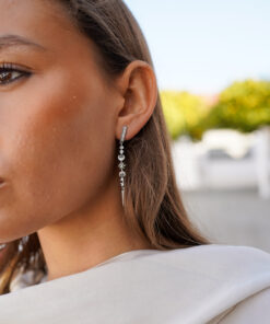 Deslumbra con estos elegantes pendientes largos de plata de ley, diseñados para destacar en cualquier ocasión. Inspirados en motivos celestiales, combinan estrellas, lunas y detalles geométricos delicadamente engarzados. Las circonitas de alta calidad aportan un brillo sofisticado, mientras que el diseño alargado estiliza el rostro y añade un toque glamuroso.