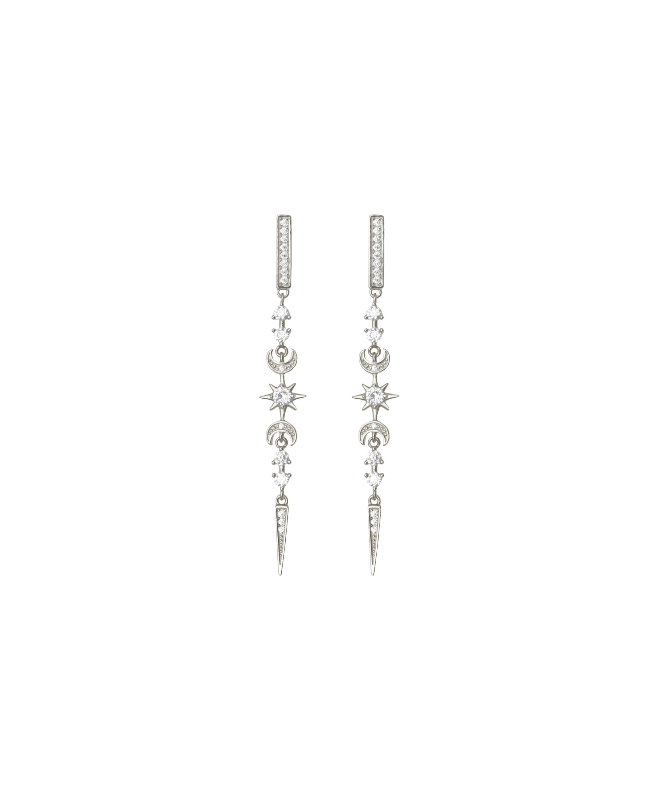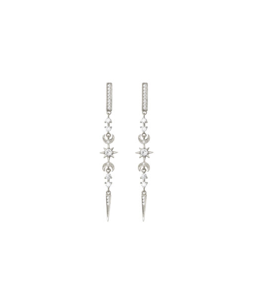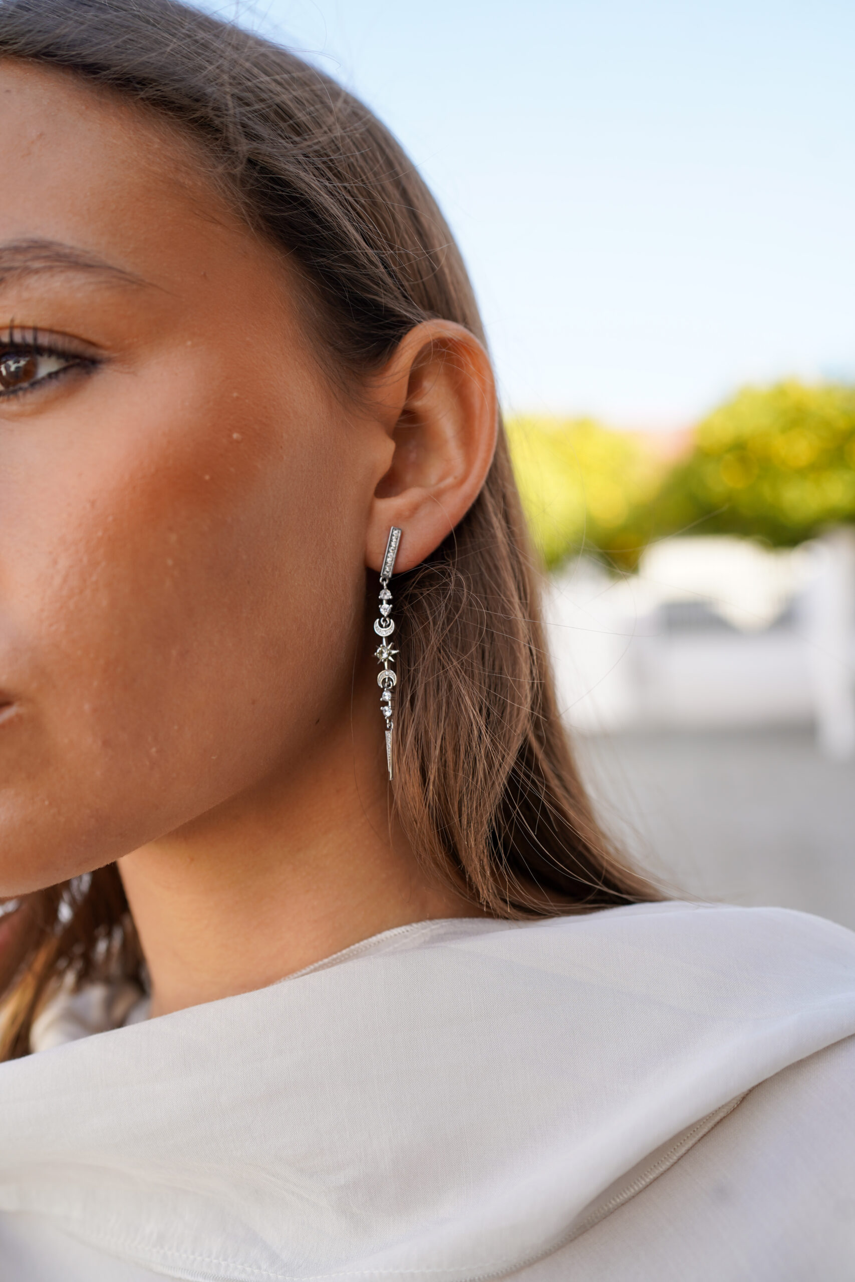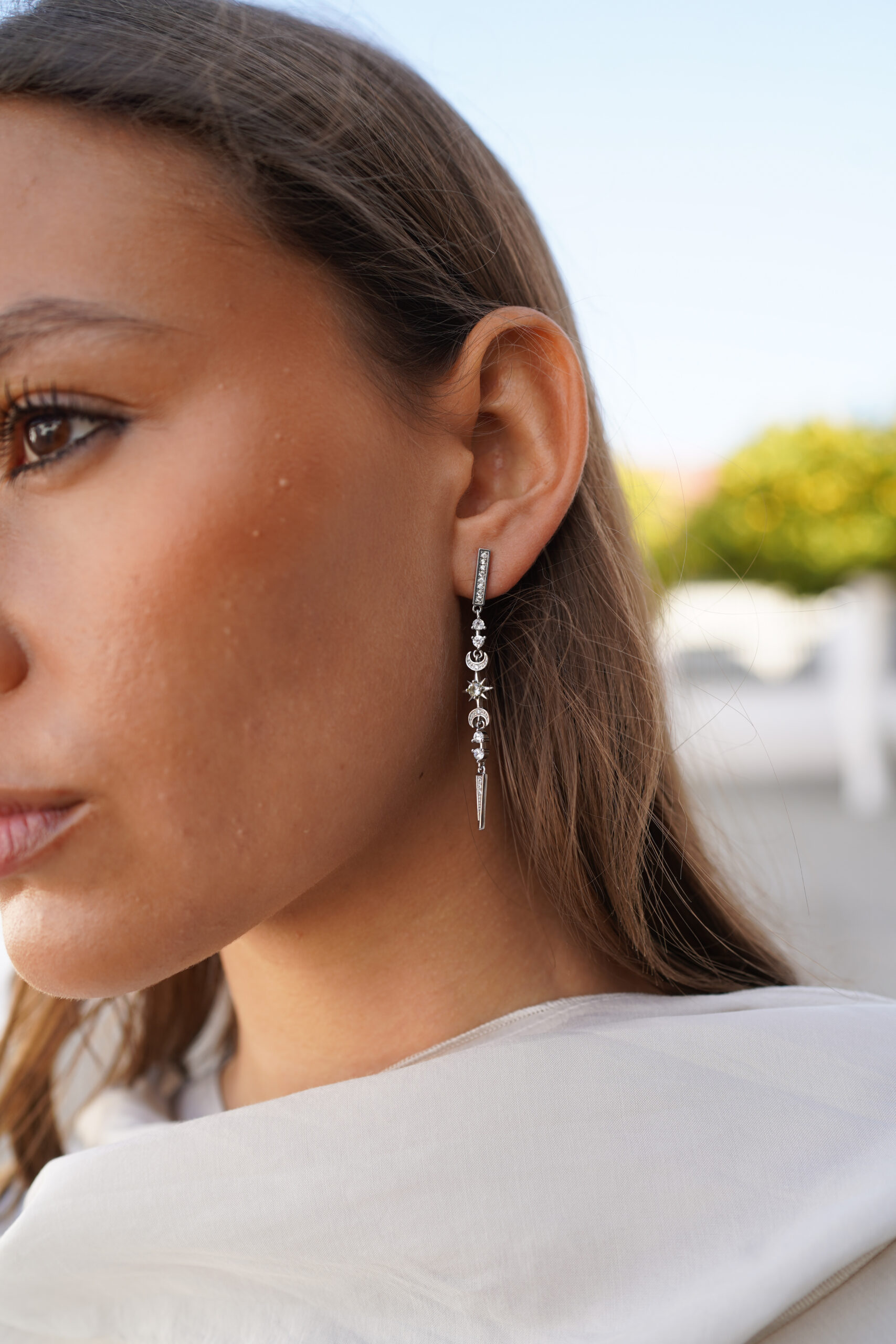 Pendientes largos de plata de ley con motivos celestiales y circonitas.