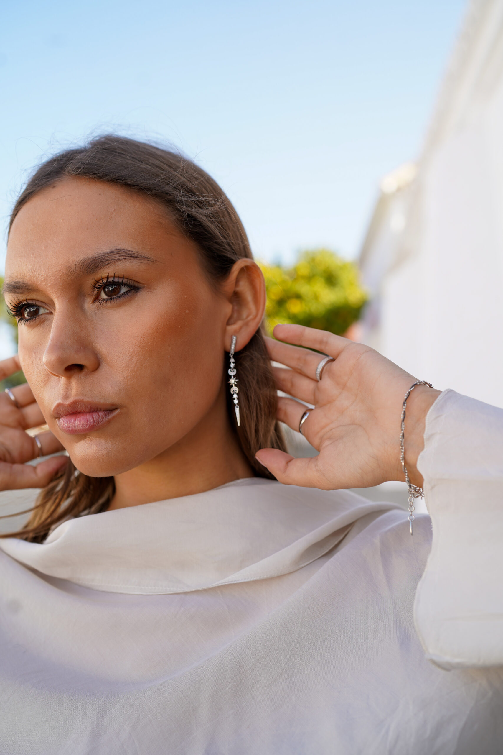 Deslumbra con estos elegantes pendientes largos de plata de ley, diseñados para destacar en cualquier ocasión. Inspirados en motivos celestiales, combinan estrellas, lunas y detalles geométricos delicadamente engarzados. Las circonitas de alta calidad aportan un brillo sofisticado, mientras que el diseño alargado estiliza el rostro y añade un toque glamuroso.