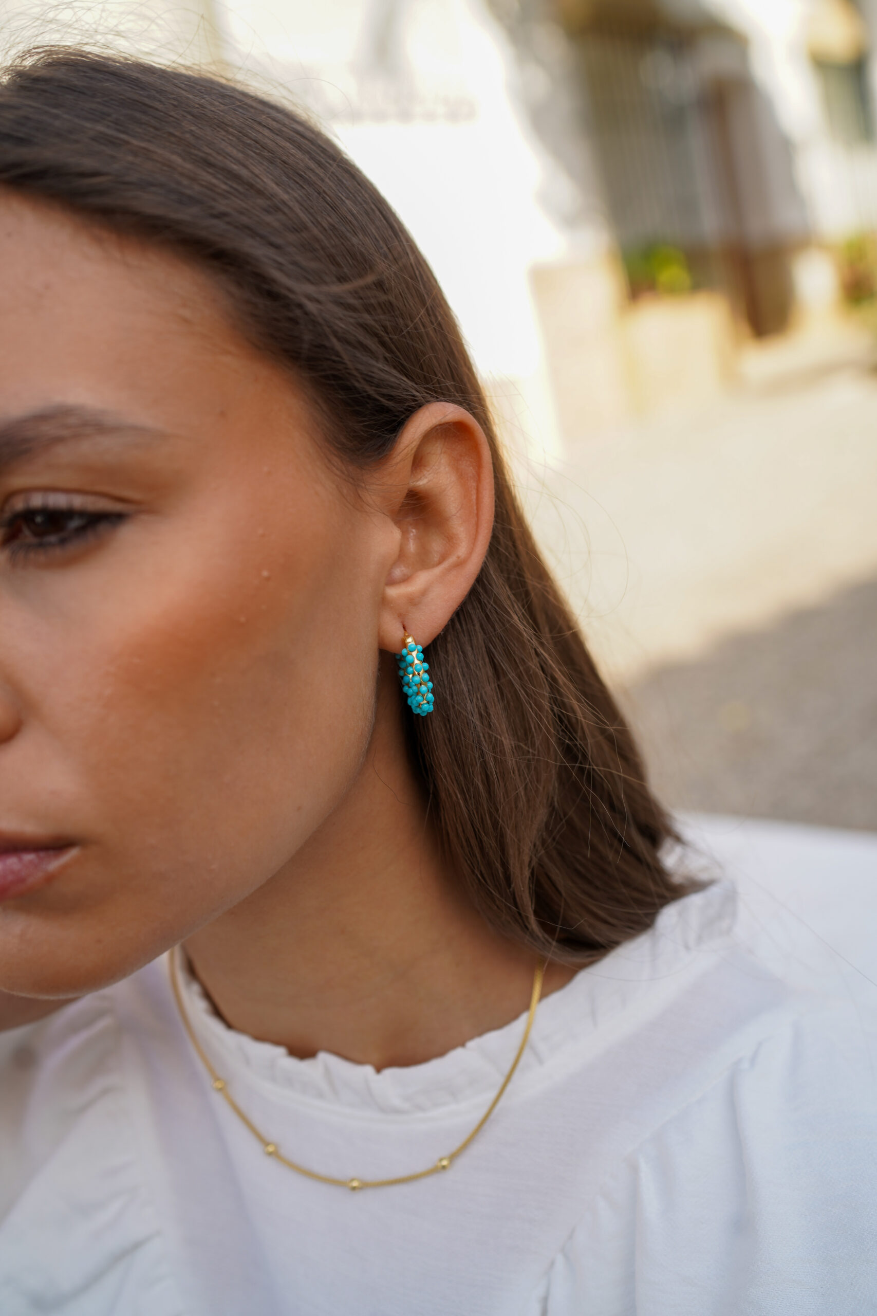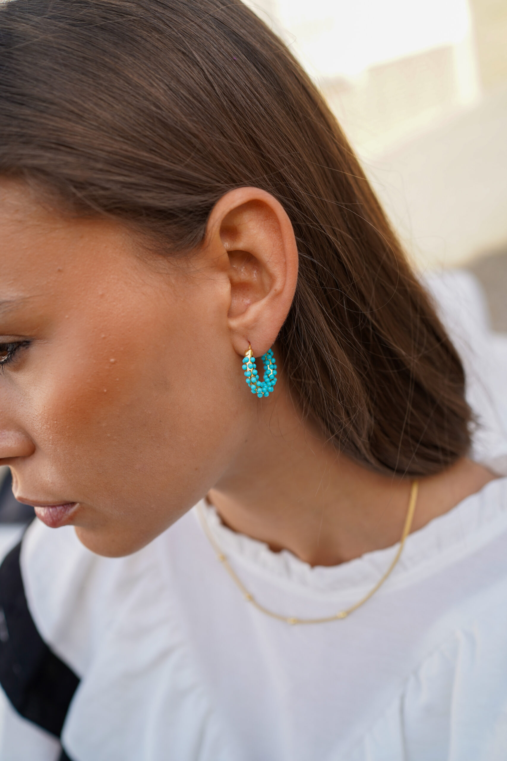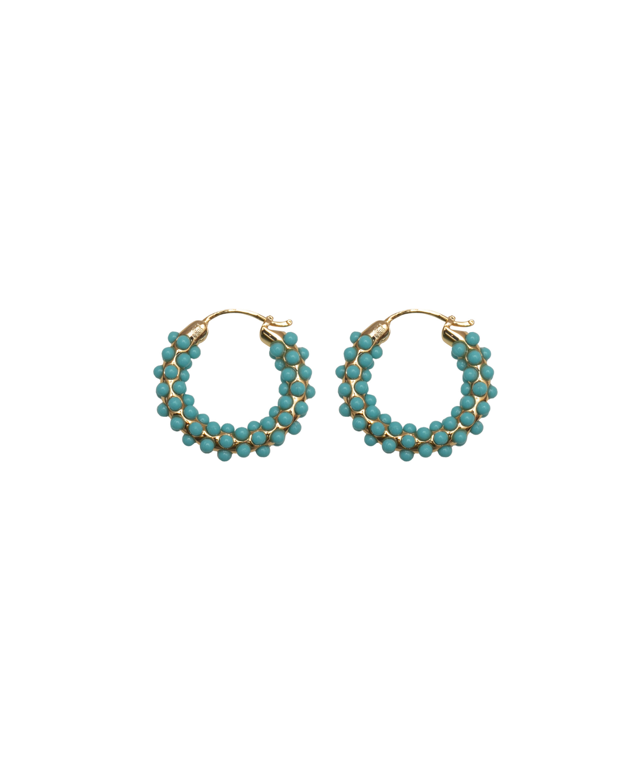 Pendientes aro en plata de ley chapado en oro cubierto por mini piedras color turquesa.