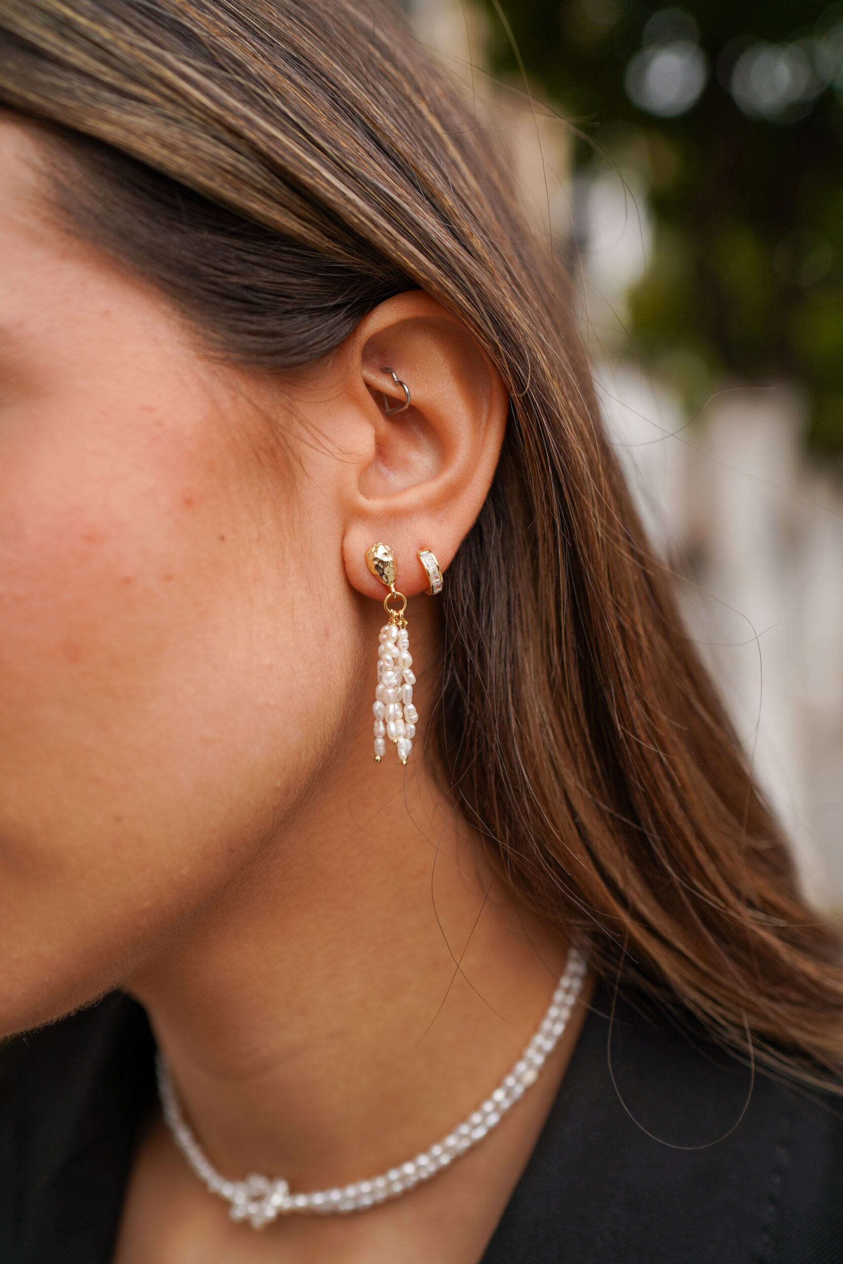 Pendientes en plata de ley chapada en oro con diseño orgánico, formados por una pieza superior de acabado martelé de la que caen delicadas tiras de perlas de agua dulce, creando un movimiento suave y elegante. La textura irregular del metal y el brillo natural de las perlas aportan una estética artesanal y sofisticada, ideal tanto para ocasiones especiales como para elevar un look diario.