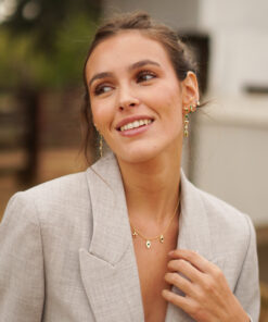 Pendientes largos en plata de ley chapados en oro con distintos motivos en forma de estrella, mano y luna con rodonita natural, malaquita, ónix y nácar.