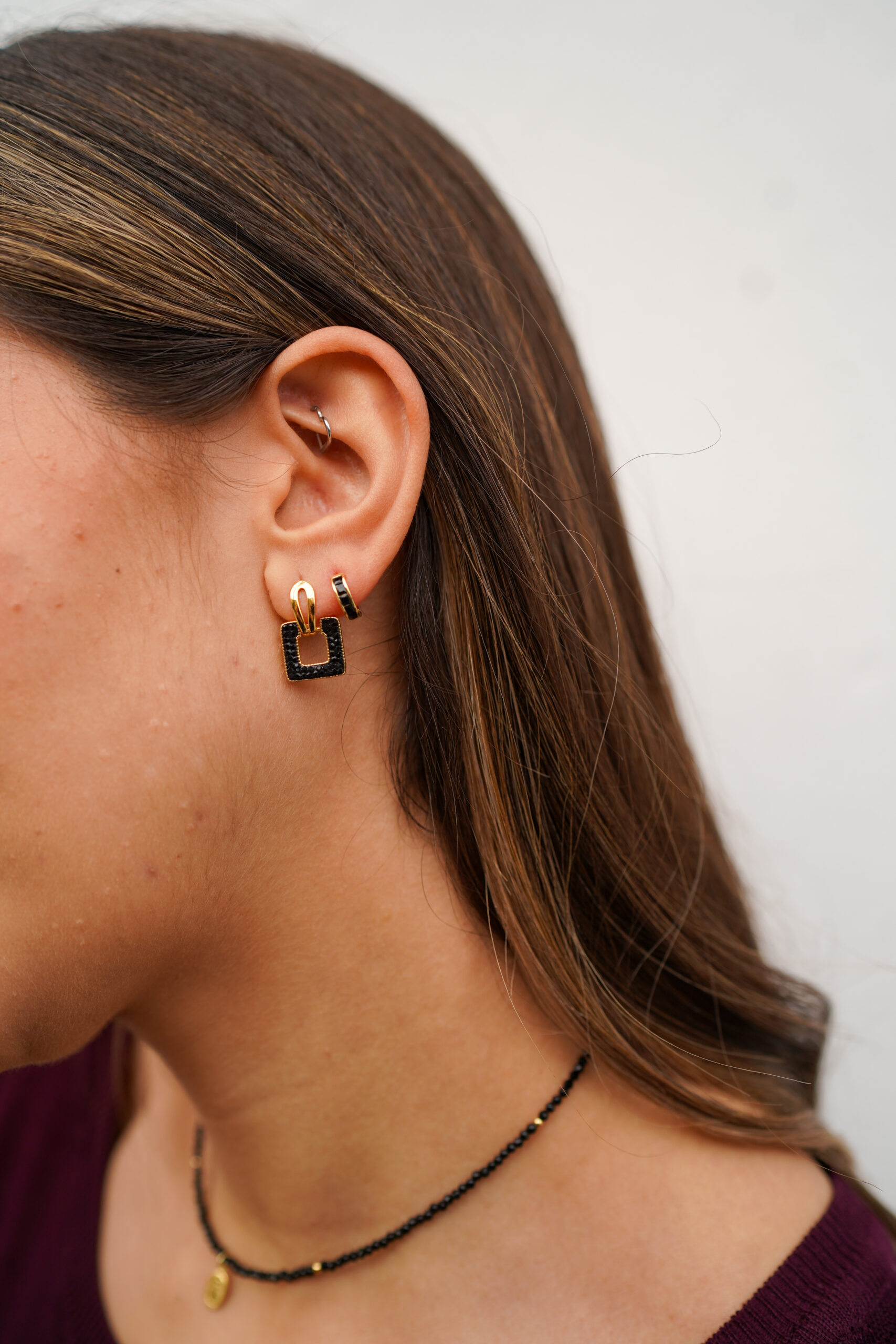 Pendientes en plata de ley chapada en oro con diseño geométrico, protagonizados por una silueta cuadrada abierta decorada con pavé de circonitas en tono negro que aporta intensidad y contraste. La combinación del dorado pulido con el negro profundo crea una pieza elegante y con carácter, perfecta para dar un toque sofisticado a cualquier look.