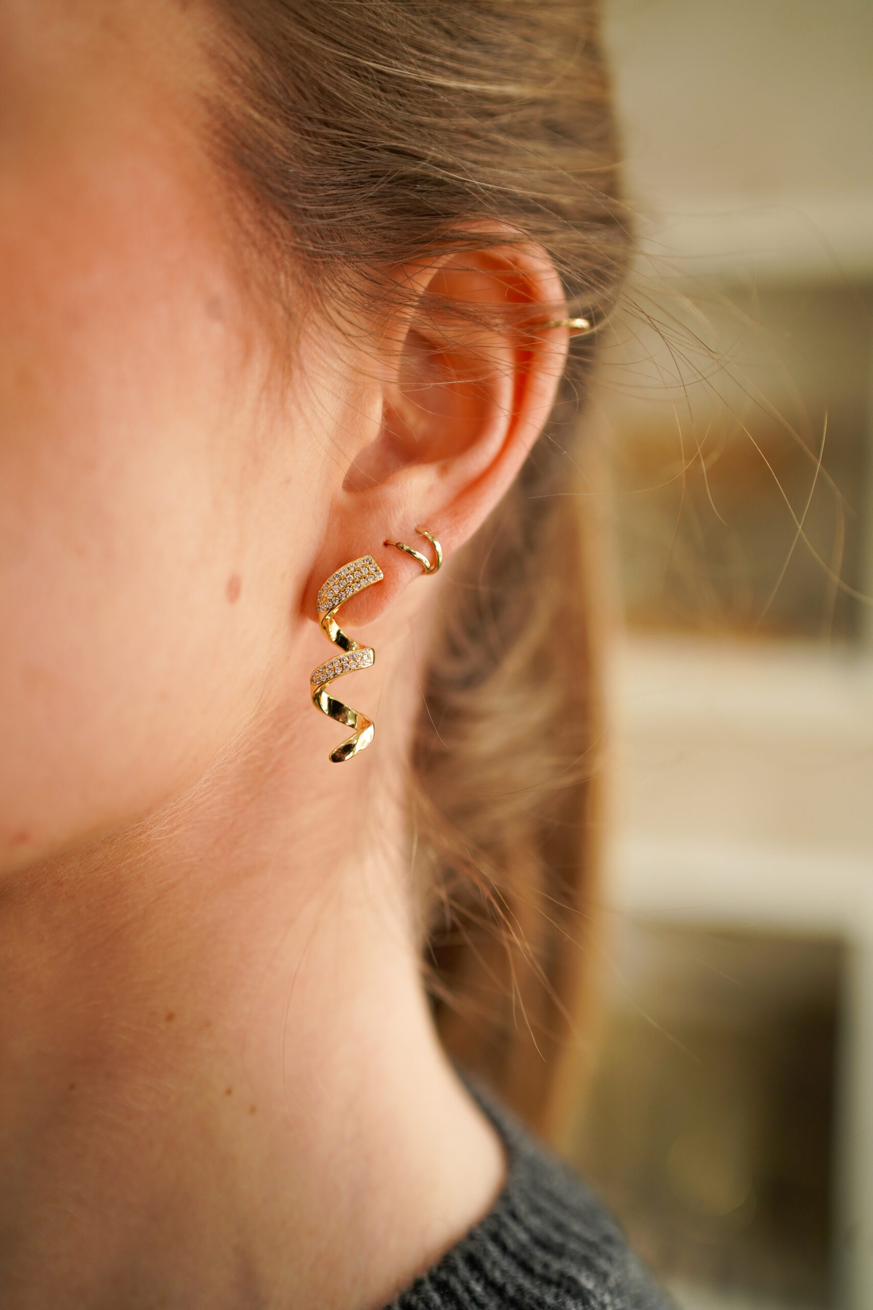 Pendientes en plata de ley chapados en oro con un diseño en forma de espiral creando un efecto moderno y lleno de movimiento. La parte superior está realzada con un pavé de circonitas blancas que aporta brillo y sofisticación, mientras que la curva pulida añade un toque elegante y contemporáneo. Una pieza llamativa, ligera y muy favorecedora.