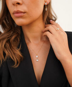 Pendientes colgantes, en plata de ley chapada en oro, con un diseño delicado y elegante que destaca por la combinación de gemas de corte facetado. La parte superior presenta una gema tono agua marina de forma cuadrada, seguida de un pequeño detalle brillante, y finaliza con una impresionante piedra en forma de lágrima que aporta movimiento y sofisticación al conjunto. Este diseño clásico y atemporal es ideal para ocasiones especiales o para añadir un toque de glamour a cualquier look.