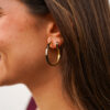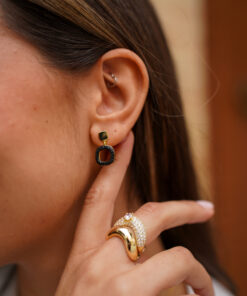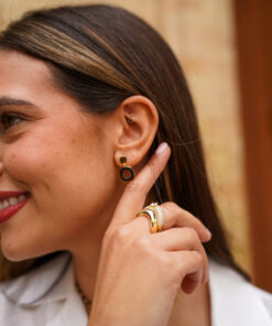 Pendientes en plata de ley chapada en oro con diseño geométrico y contemporáneo, formados por una pieza superior pulida y un colgante de forma orgánica con pavé de circonitas en tono negro que aporta profundidad y contraste. Su acabado combina líneas suaves con un carácter sofisticado, ideal para looks elegantes tanto de día como de noche.