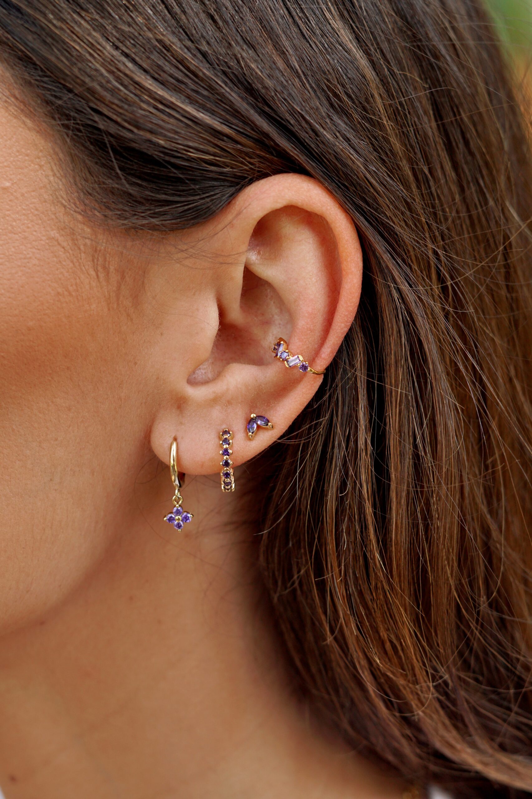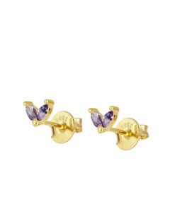 Pendientes mini en plata de ley chapados en oro con forma de hoja con dos circonitas lilas
