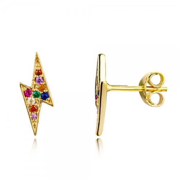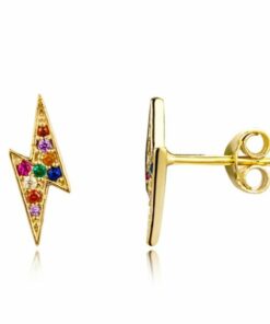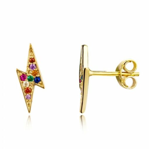 Pendientes mini en plata de ley chapados en oro con forma de rayo y circonitas de colores