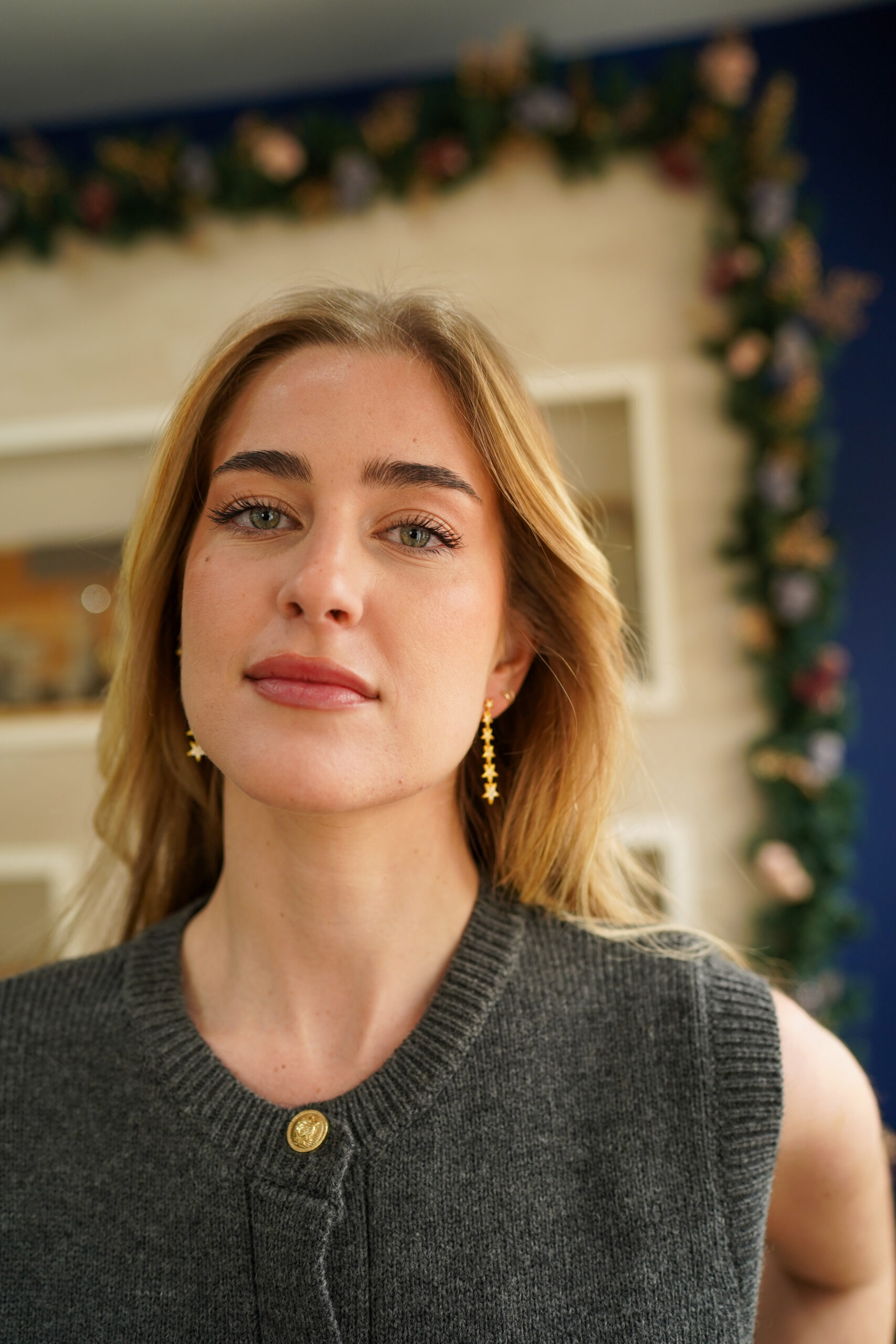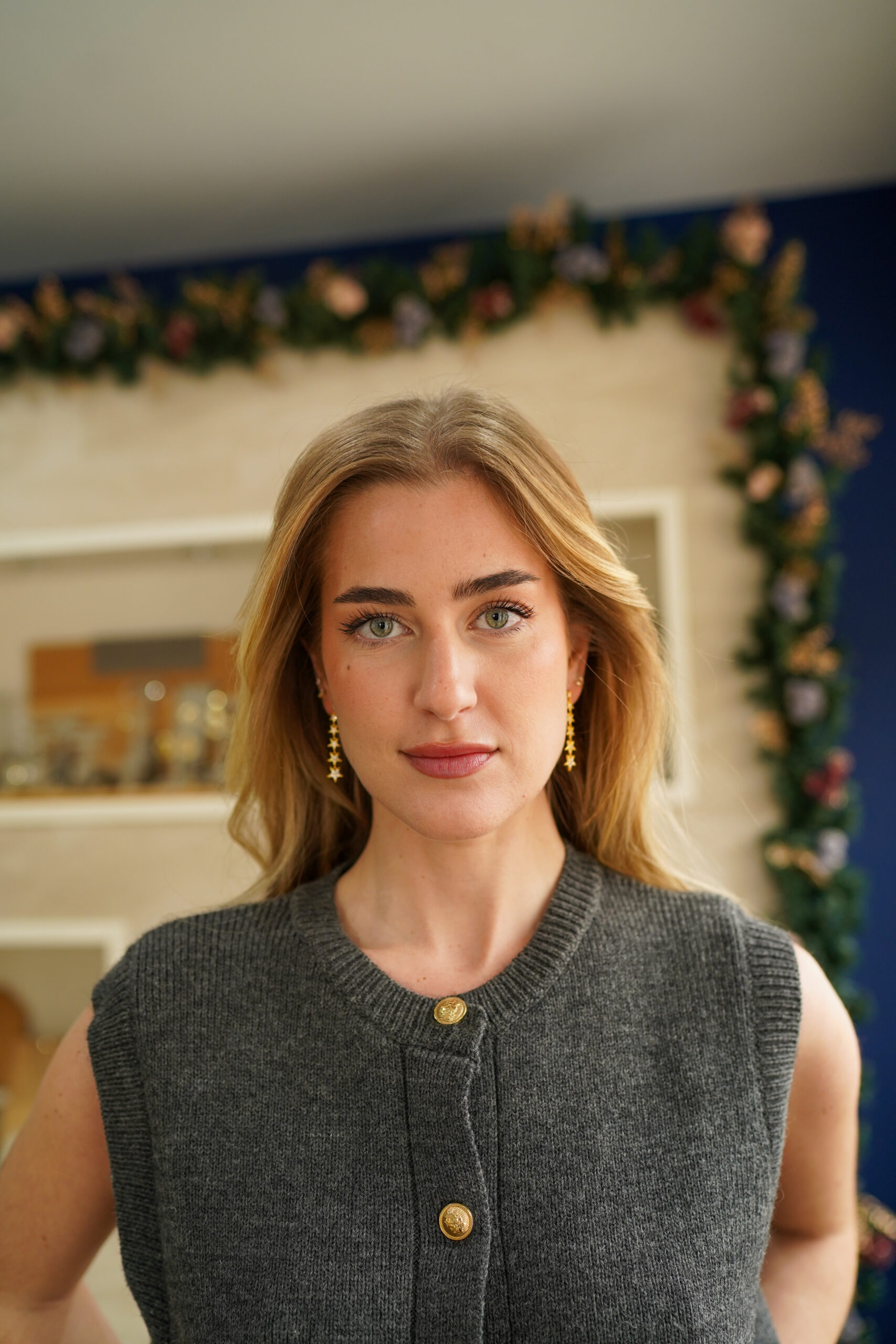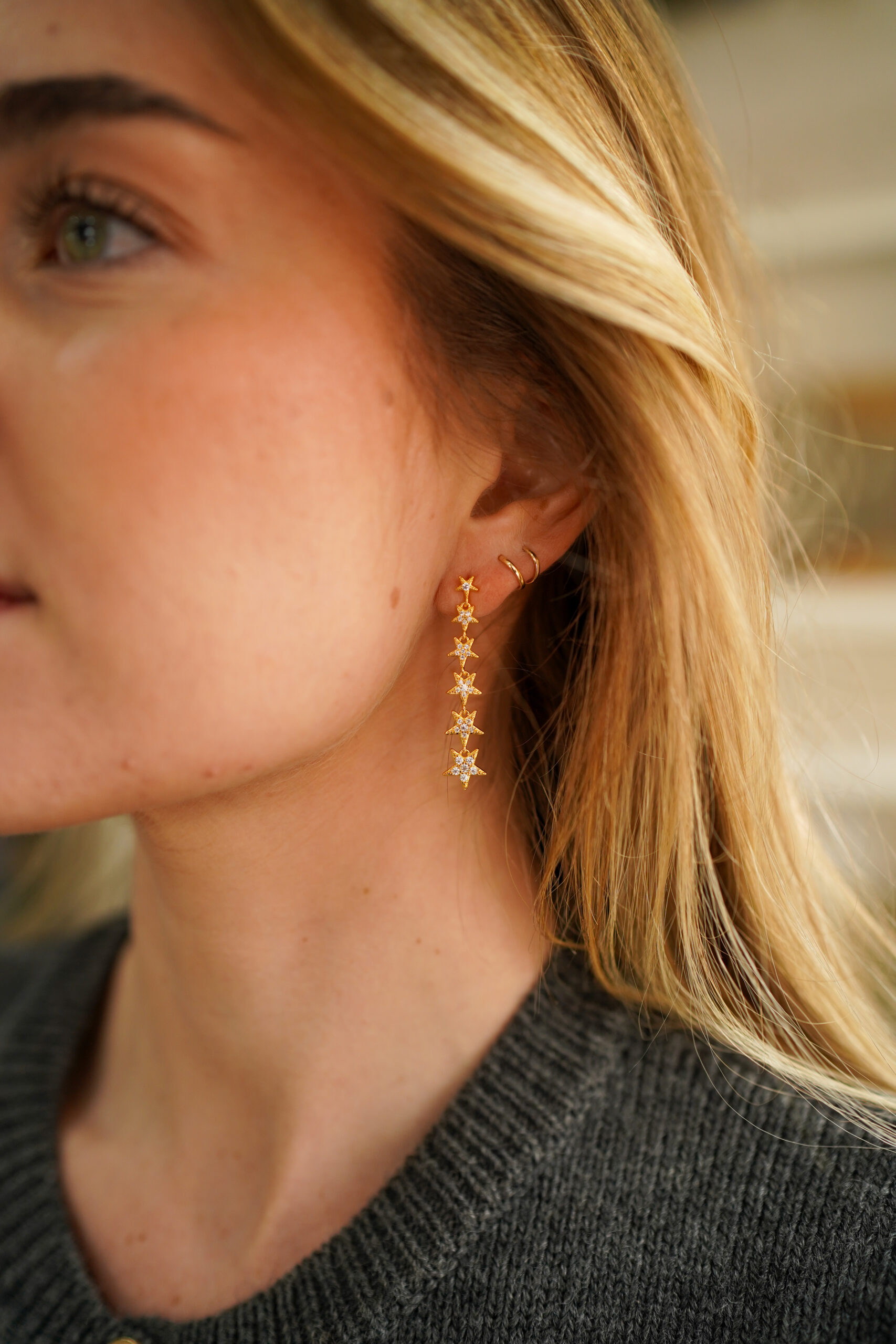 Pendientes en plata de ley chapada en oro con diseño alargado y delicado, formados por una cascada de estrellas unidas entre sí. Cada estrella incorpora un sutil pavé que aporta brillo y movimiento, creando un efecto elegante y luminoso al llevarlos puestos.