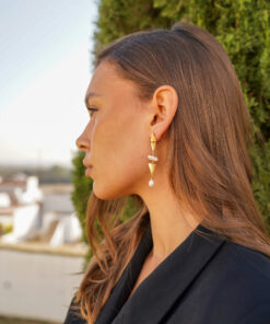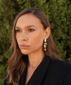 Pendientes largos colgantes, en plata de ley chapada en oro, con un diseño geométrico moderno que combina triángulos lisos y matizados dorados con detalles de perlas naturales. La mezcla de formas angulares y la delicadeza de las perlas crea un contraste sofisticado y elegante, ideal para ocasiones especiales o para añadir un toque distintivo a tu estilo diario.