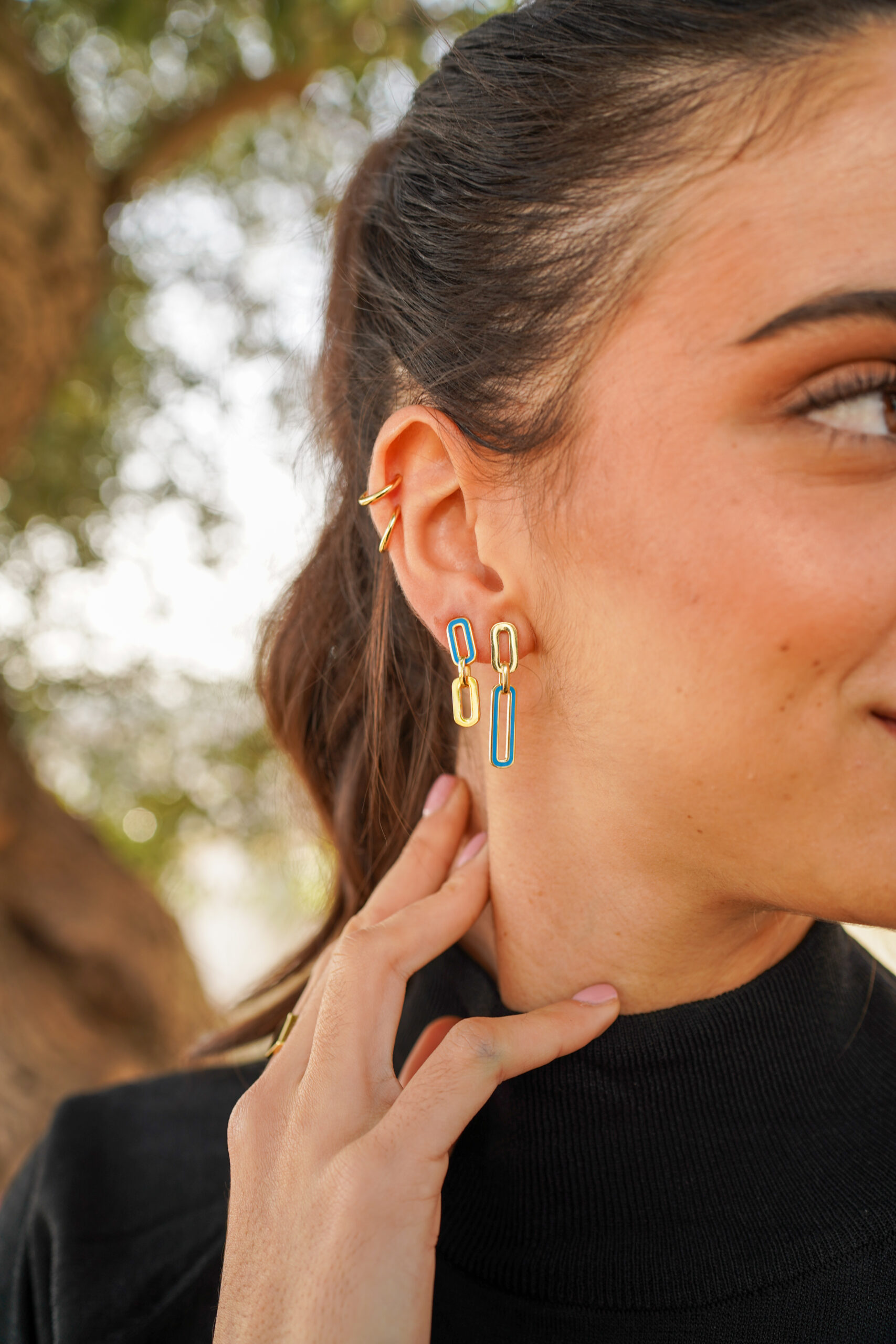 Pendientes en plata de ley chapado en oro con tres eslabones colgando, siendo el primero de esmalte color azul.