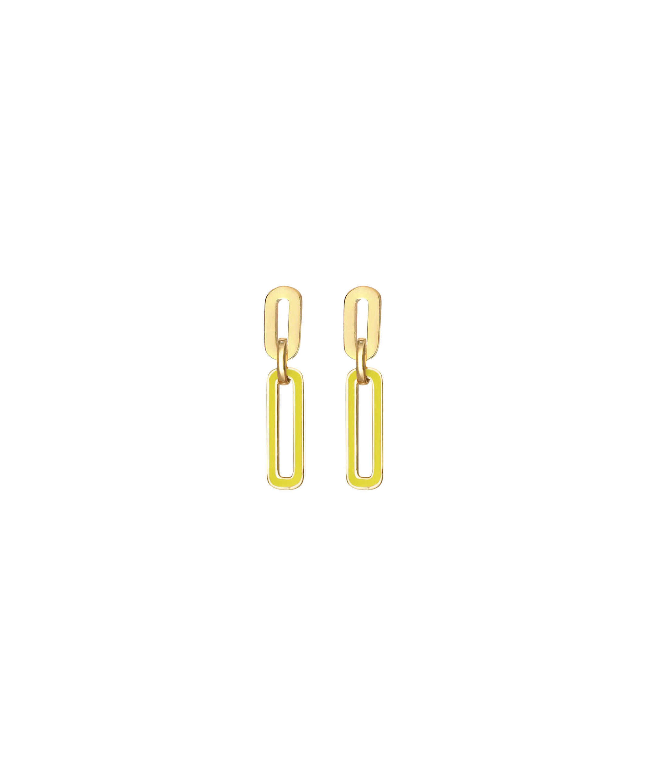 Pendientes en plata de ley chapado en oro con tres eslabones colgando, siendo el último más alargado y de esmalte color amarillo flúor.