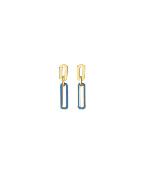 Pendientes en plata de ley chapado en oro con tres eslabones colgando, siendo el último más alargado y de esmalte color azul.