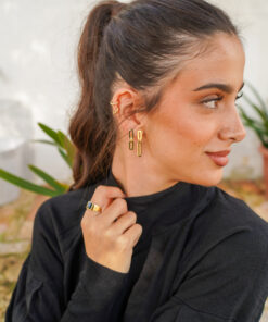 Pendientes en plata de ley chapado en oro con tres eslabones colgando, siendo el primero de esmalte color negro.